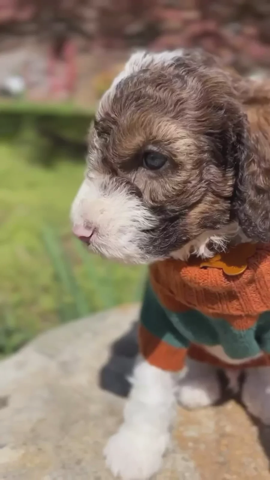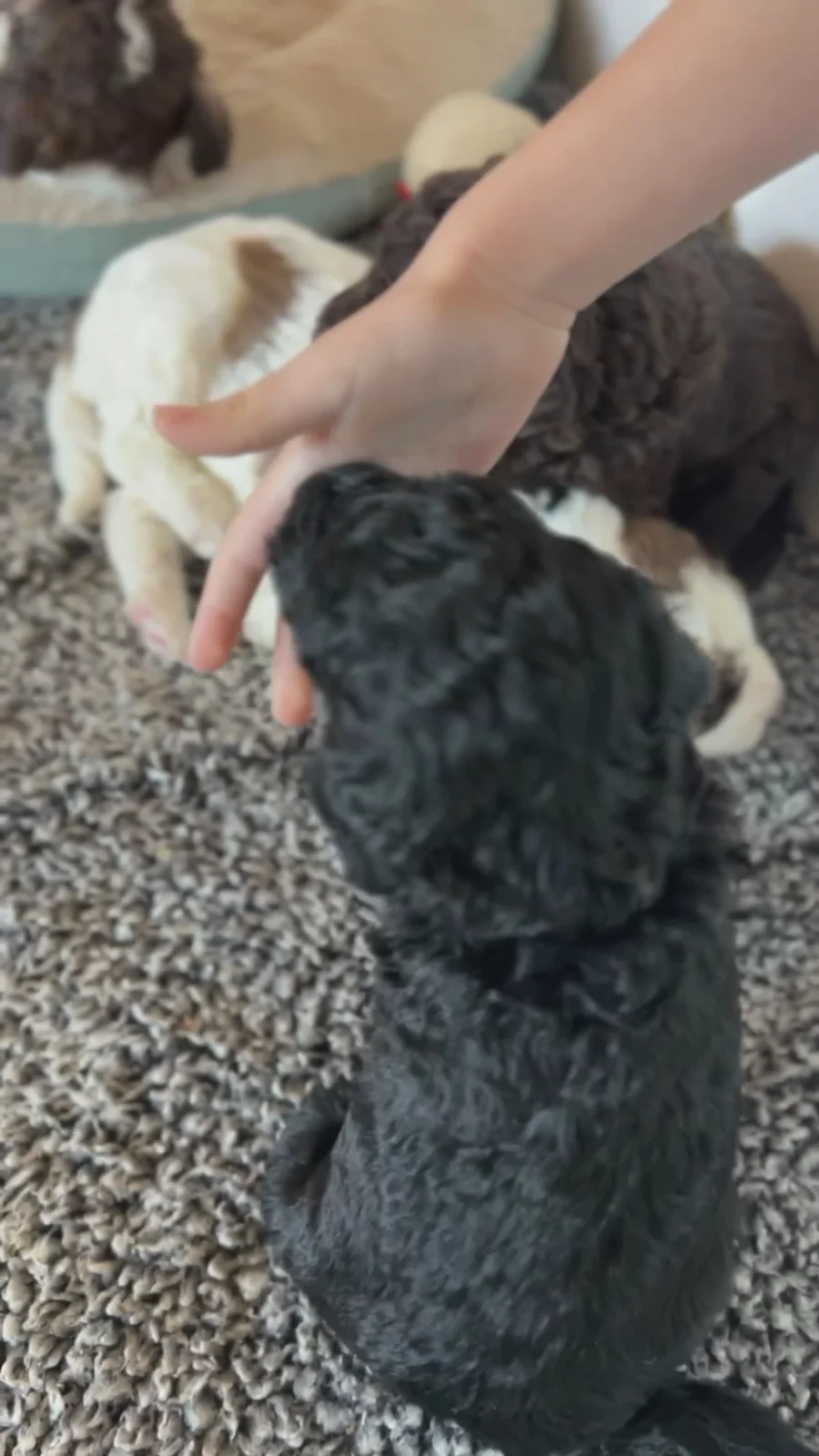 Meet Pax — another gorgeous tri-colored F1b Whoodle boy with coloring very similar to Shep’s and the sweetest expression. Pax has a gentle, easygoing temperament and a thoughtful personality that really shines when he is spending time with people. He enjoys attention, settles nicely when held, and has a calm, affectionate presence that makes him easy to fall in love with. He also has a playful side and enjoys joining in on puppy fun, giving him a lovely balance of sweetness and personality. Pax would be a wonderful match for a family looking for a loving, steady companion with a soft and loyal nature.