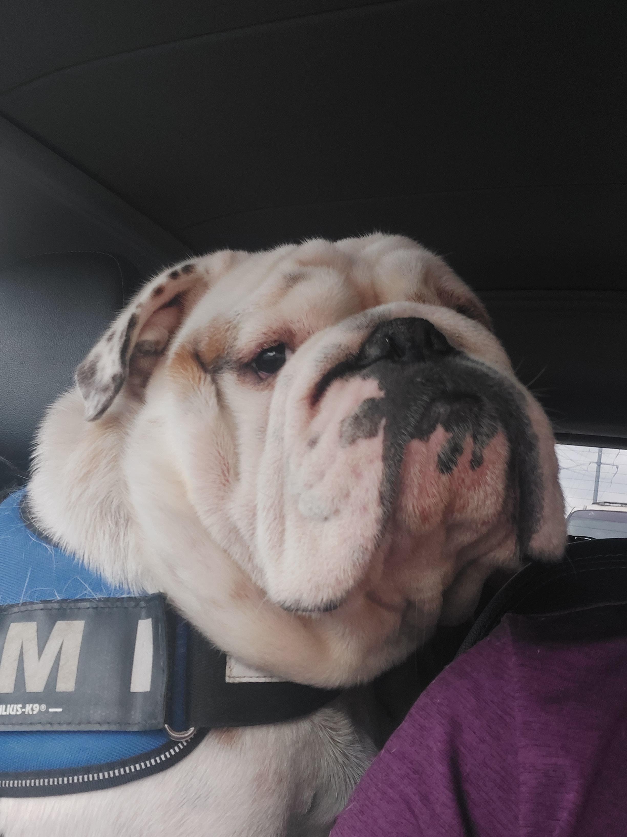 Maggie, Moose, Moo Moo is a female Bulldog. Carefully selected as a great representative of her breed, Malony decided to make her part of their program. Malony has passed Good Dog’s screening process, which involved a review of their breeding practices, environment, and the mental and physical health of their dogs.
