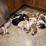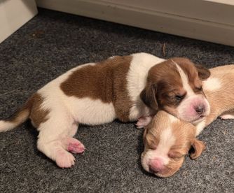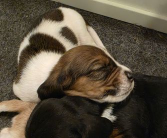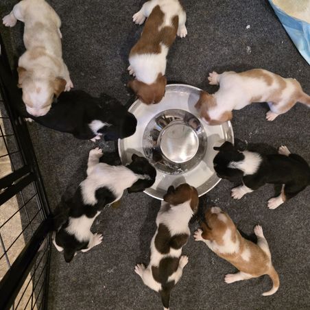 Our puppies include black white and tan, mahogany and white, lemon and white, black brown and white, and red and white. Colors will vary depending on the parent dogs.