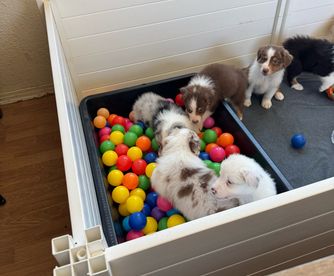 Our puppies include black, red merle, blue merle, red, and black tri-color. Colors will vary depending on the parent dogs.