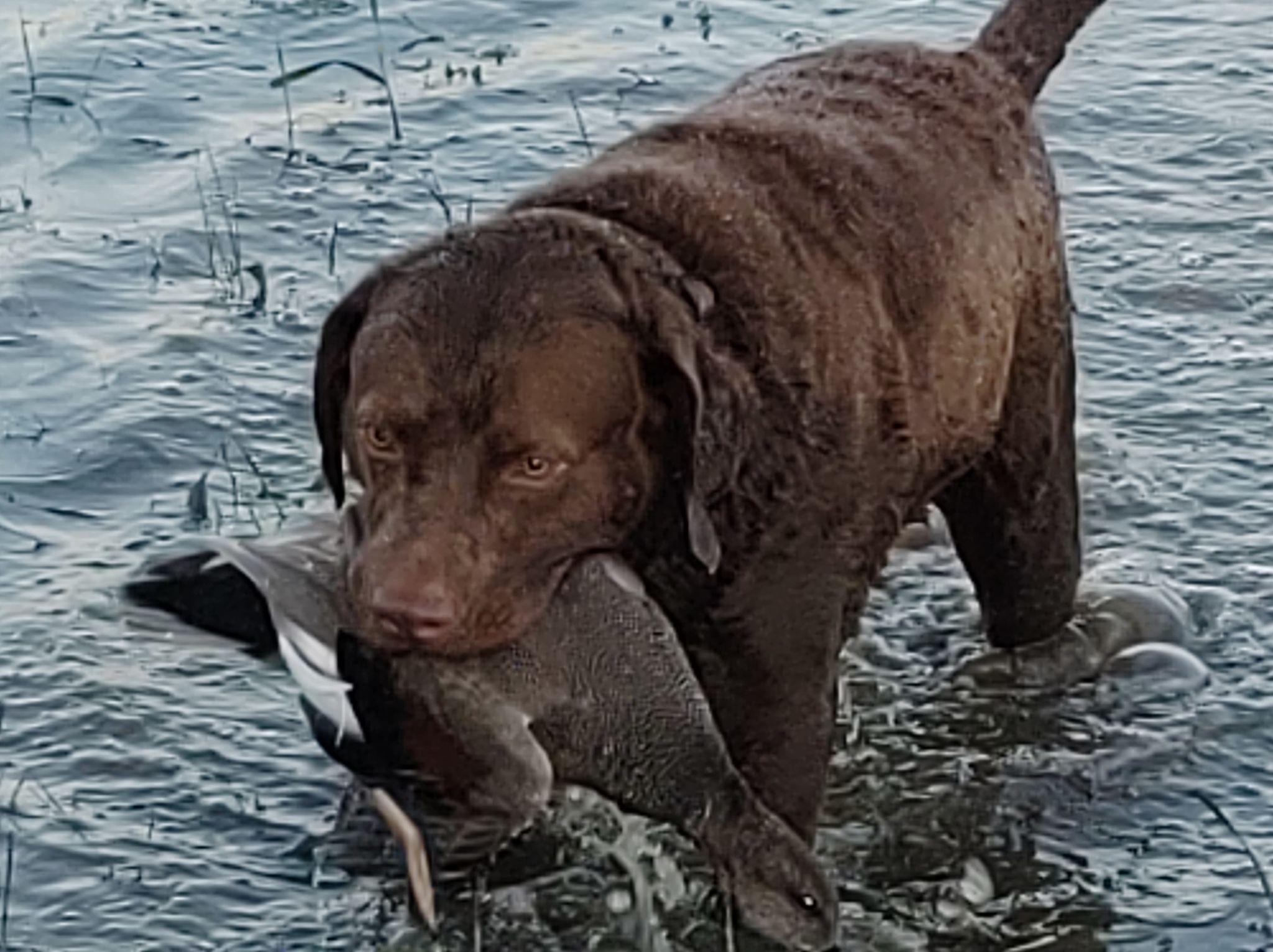 shot is a female Chesapeake Bay Retriever. Carefully selected as a great representative of her breed, Franklin decided to make her part of their program. Franklin has passed Good Dog’s screening process, which involved a review of their breeding practices, environment, and the mental and physical health of their dogs.