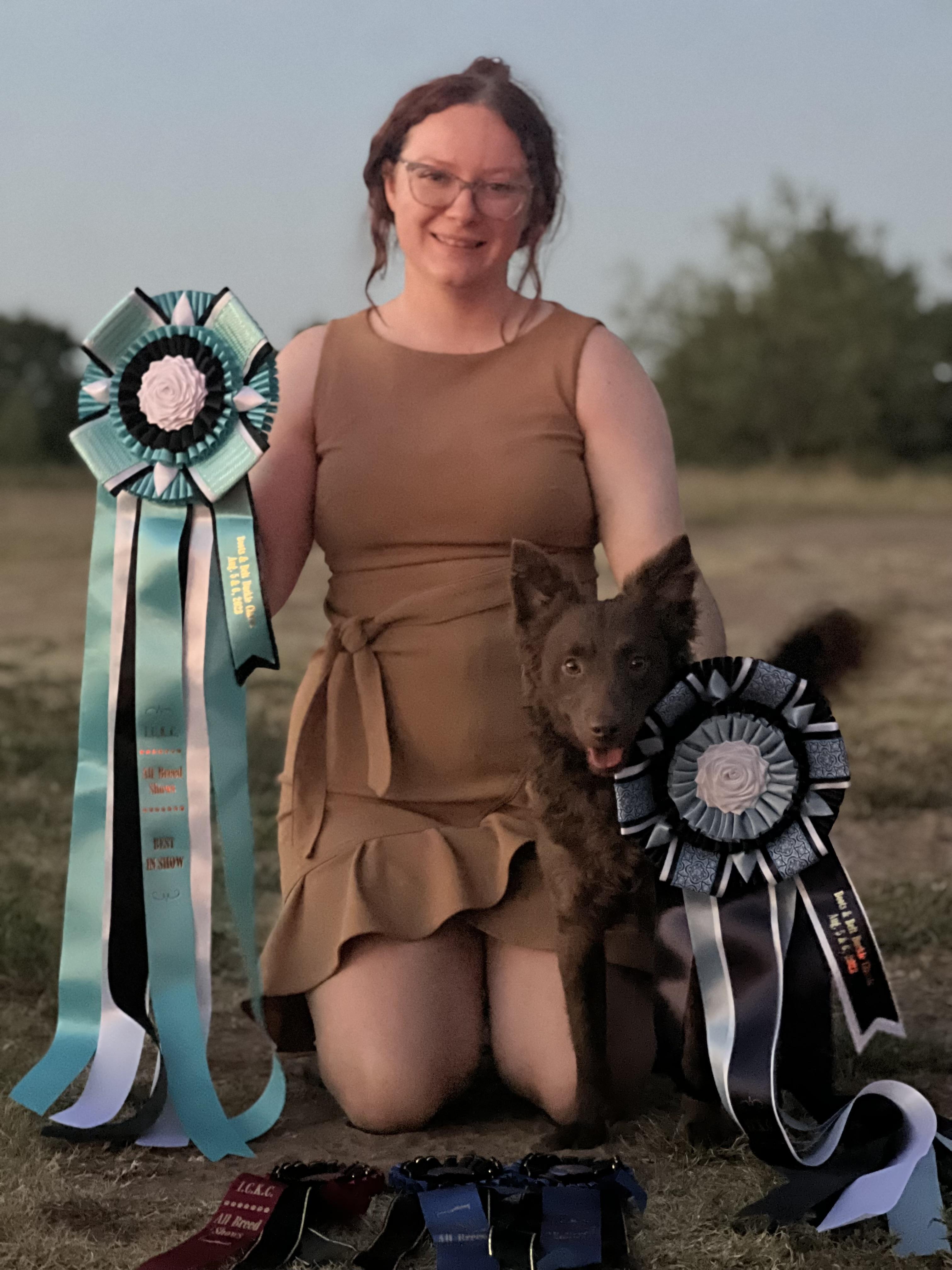 Shiner is an AKC grand champion. He was ranked as the number 8 Mudi in the US in 2023. He was the 20th fastest Mudi in 2024. He was awarded the Versatile Mudi award from the Mudi Club Of America in 2024. He is loving, friendly, and life of the party!