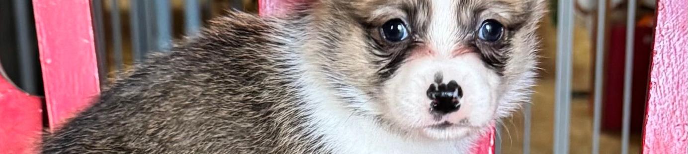 Our Cardigan Welsh Corgi puppies include blue merle and white and black and white. American Corgi puppies include black and white and blue merle and white. Pembroke Welsh Corgi puppies include red, sable, white and black, white and red, blue, and black and tan. Colors will vary depending on the parent dogs.