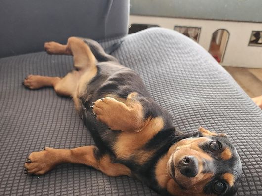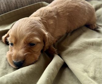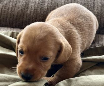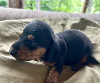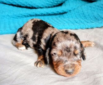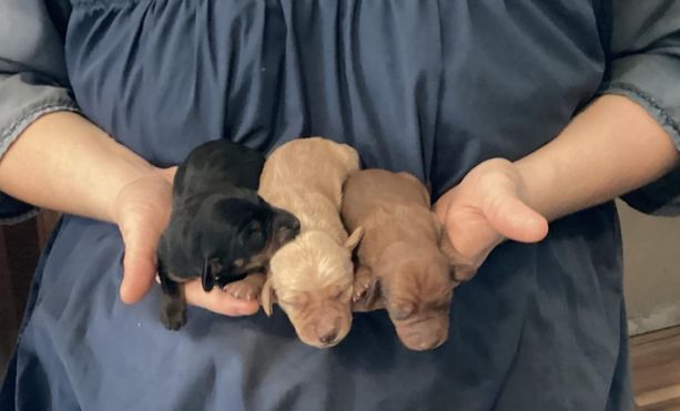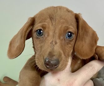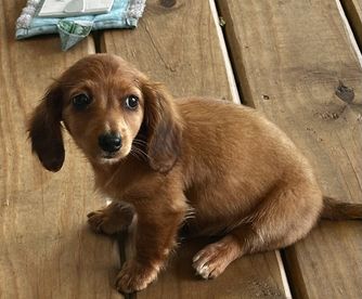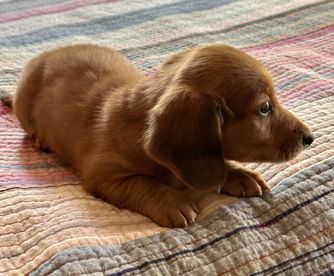 Chatty is CKC registered. Her babies arrive in a wide range of colors including red, chocolate, cream, and dapple. She most often has smooth coat babies but occasionally will give birth to a longhaired puppy.
