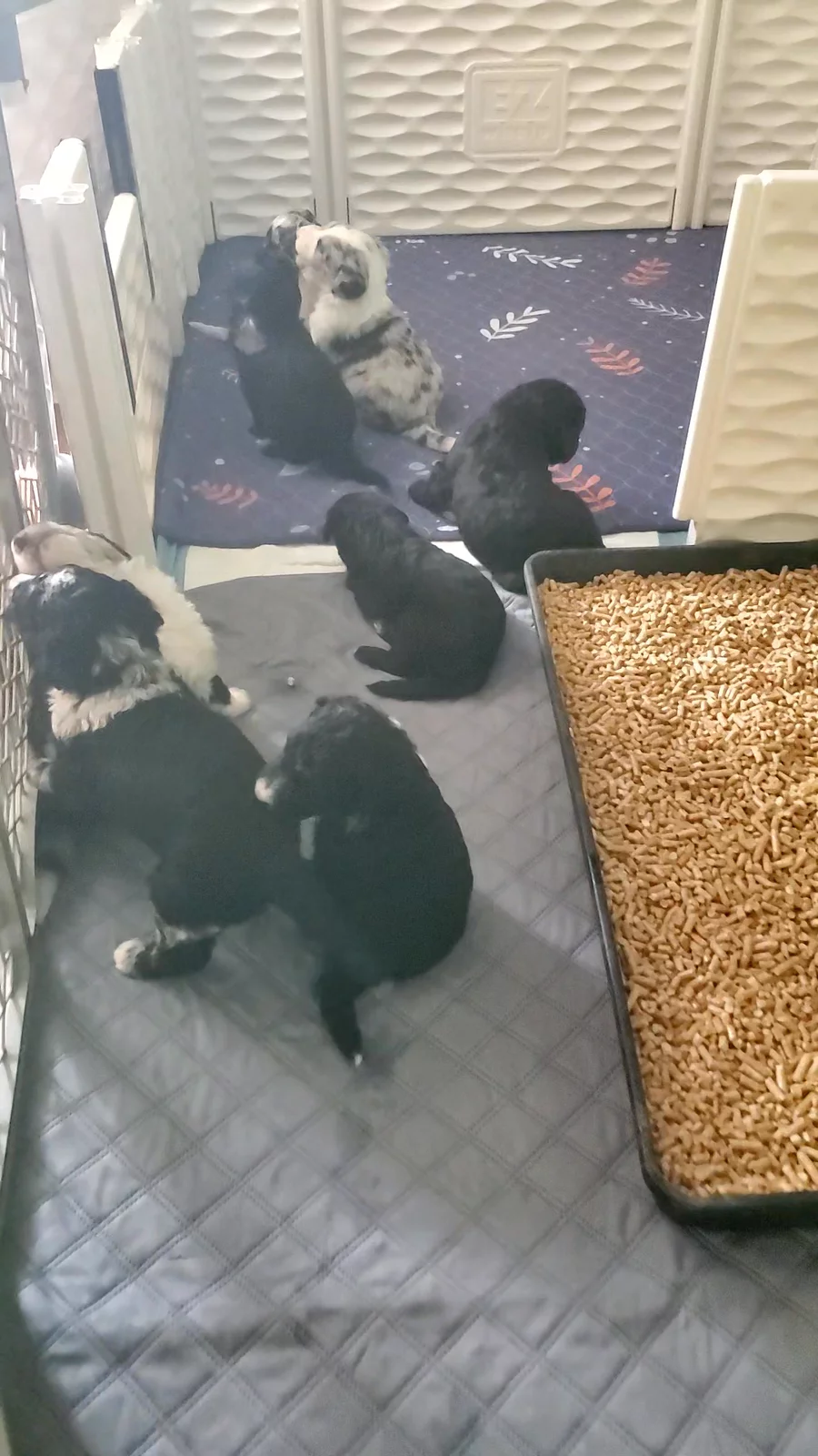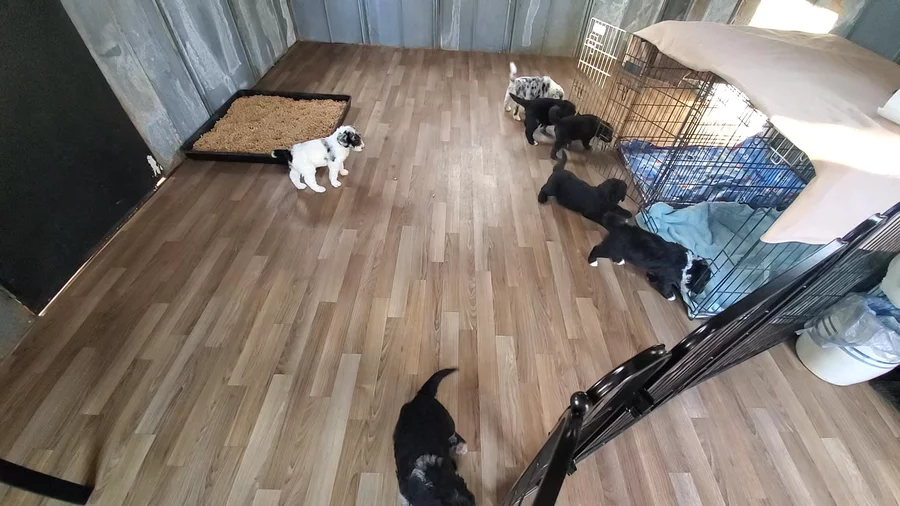 Our puppies include black, black and white, and merle. Colors will vary depending on the parent dogs.