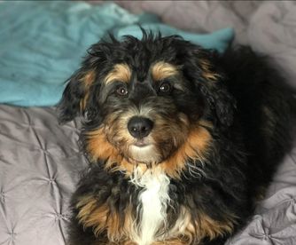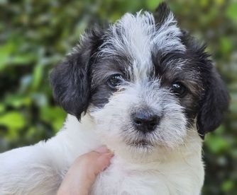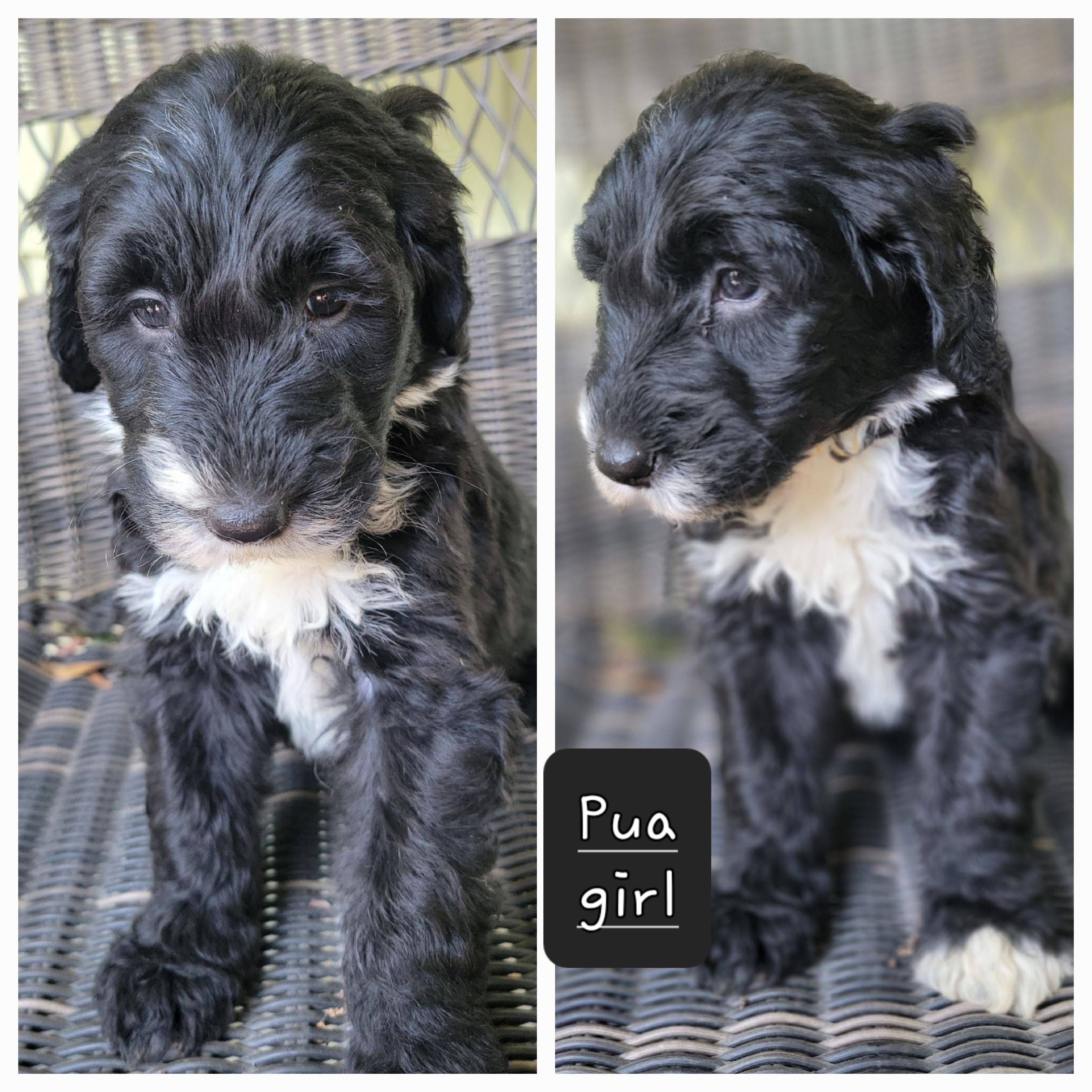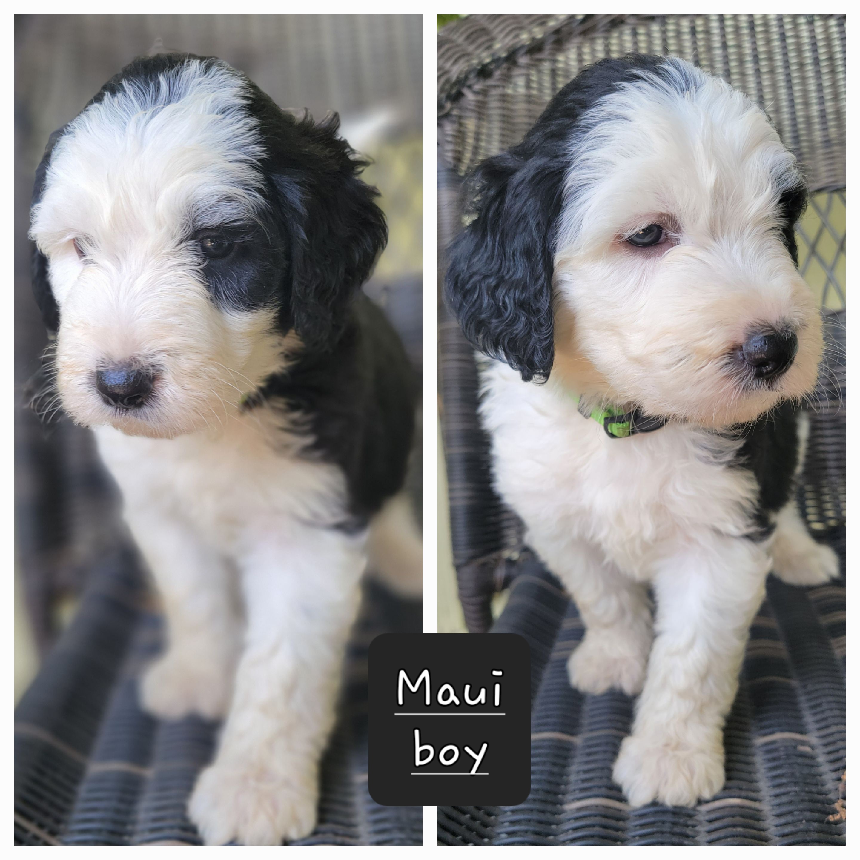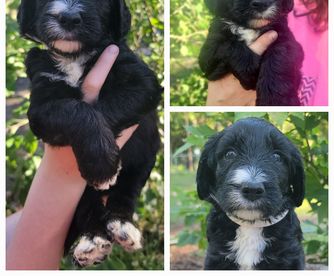 Sheepadoodle puppies are black and white. Colors will vary depending on the parent dogs.