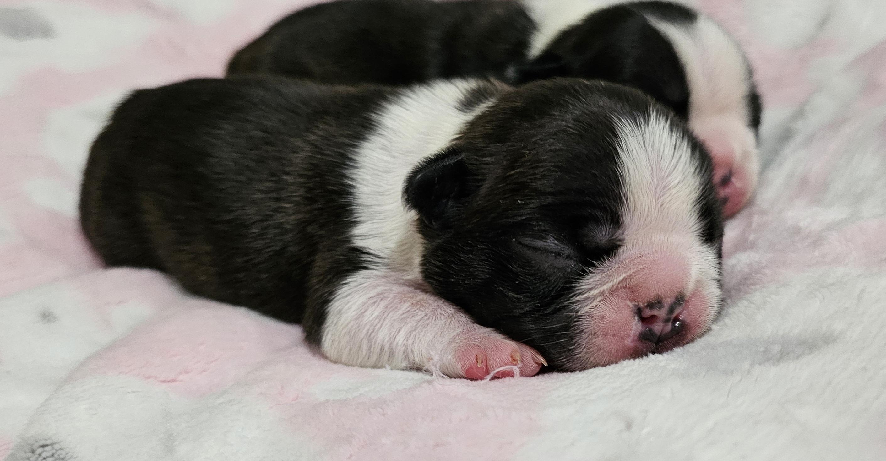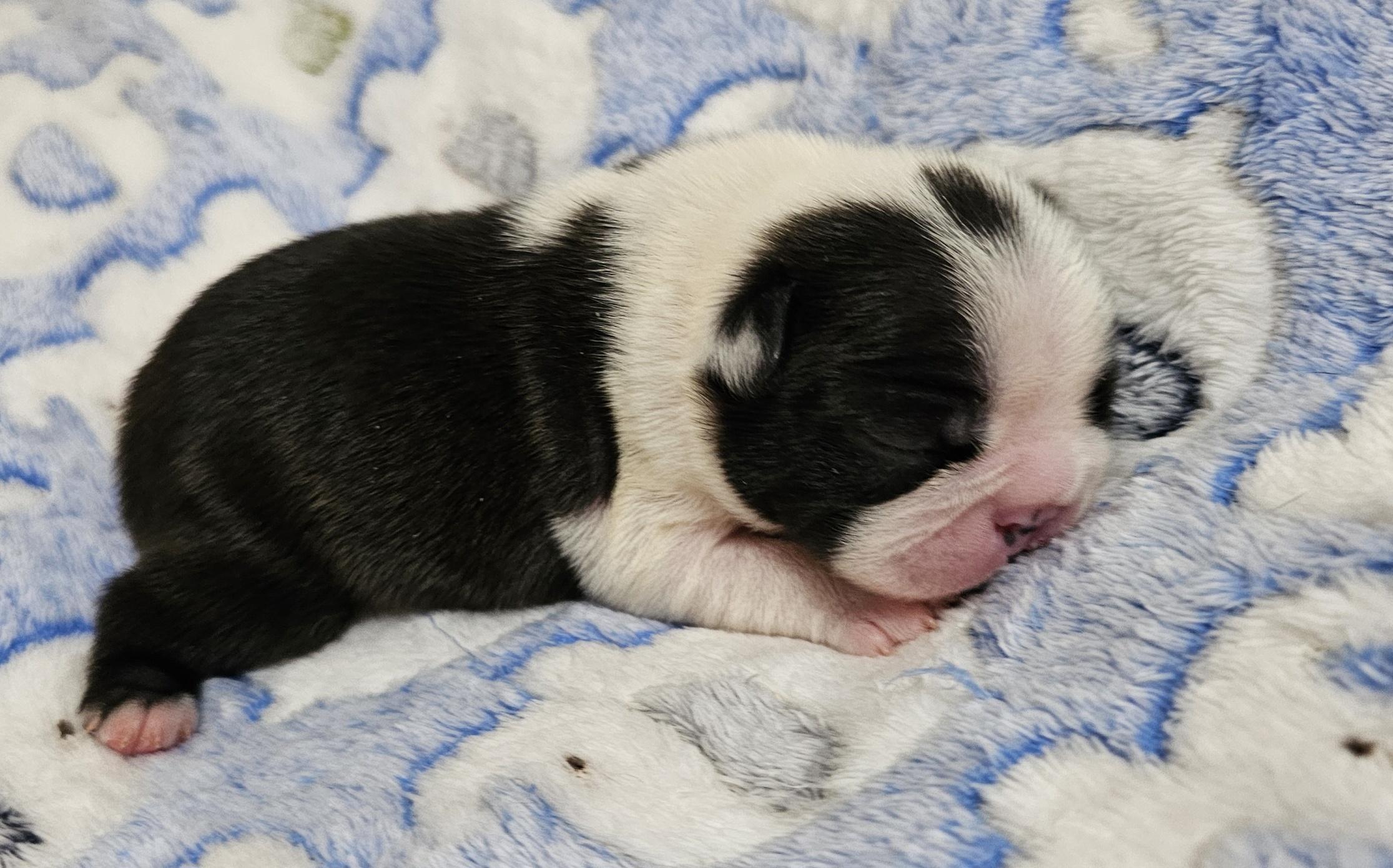 Our puppies include seal and white, black brindle and white, and black and white. Colors will vary depending on the parent dogs.