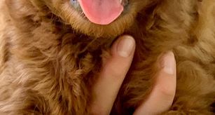 Mama Bubbles is a 55 lbs. solid red F1 Goldendoodle and full of fun and excitement. She is a loving mama and she thinks her ball is the best thing ever. She likes to check in on each person in the family and enjoys a good belly rub.