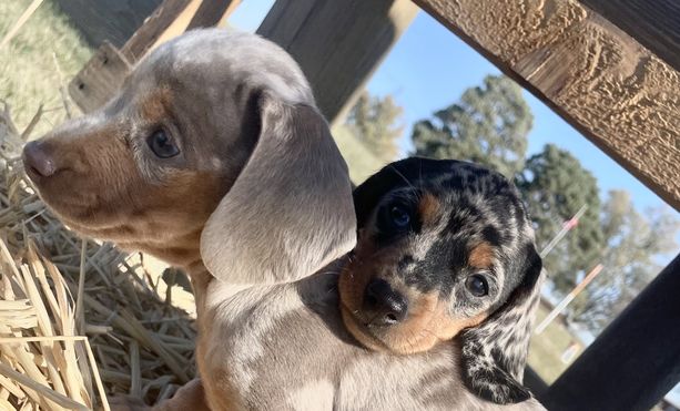 Our puppies include chocolate and tan, fawn (isabella) and tan, and dapple. Colors will vary depending on the parent dogs.