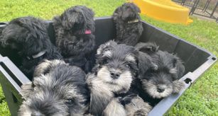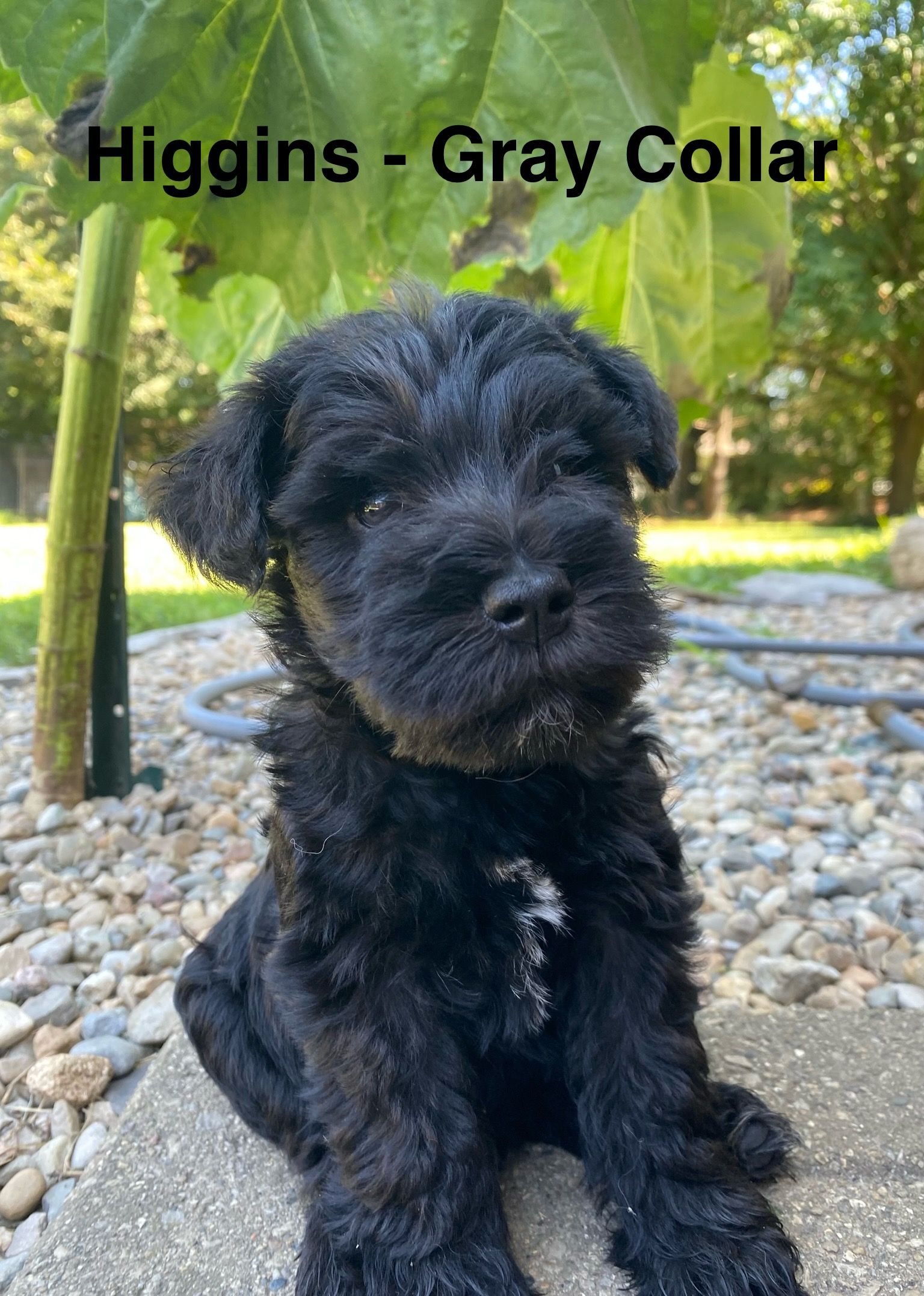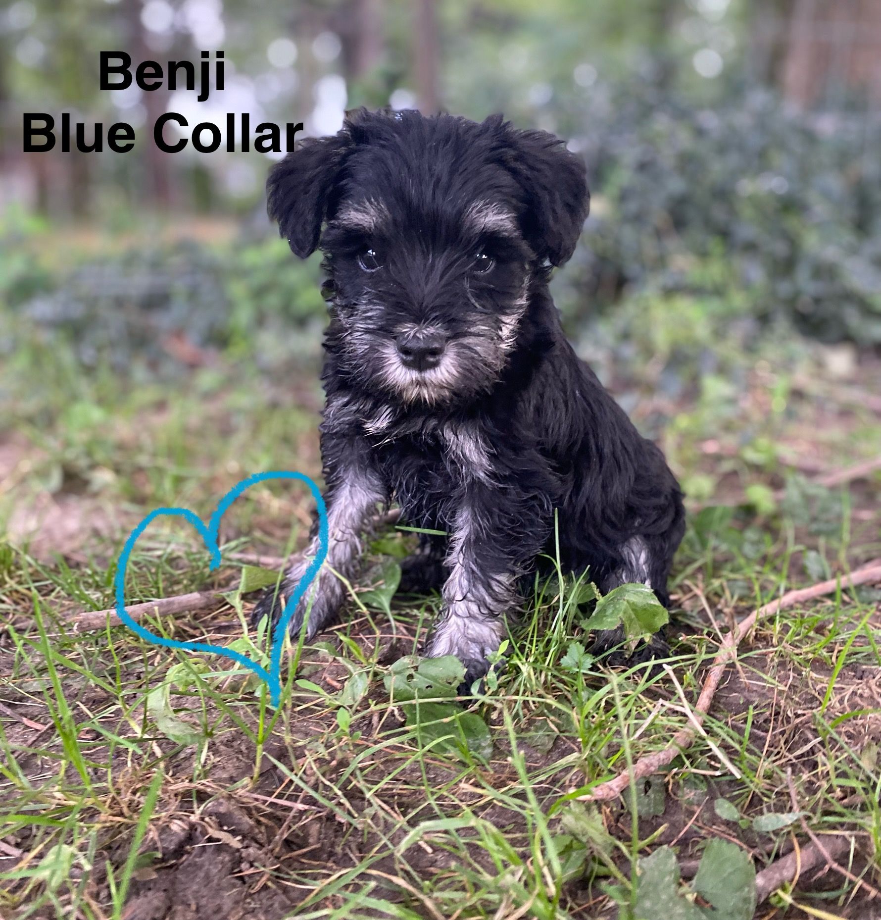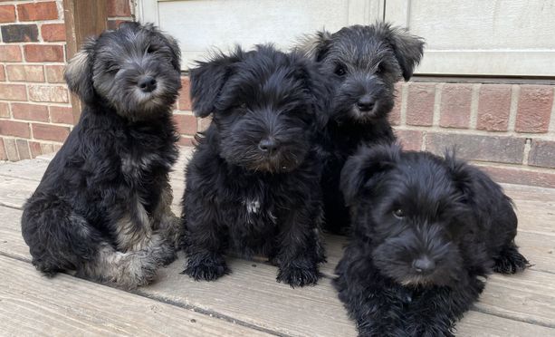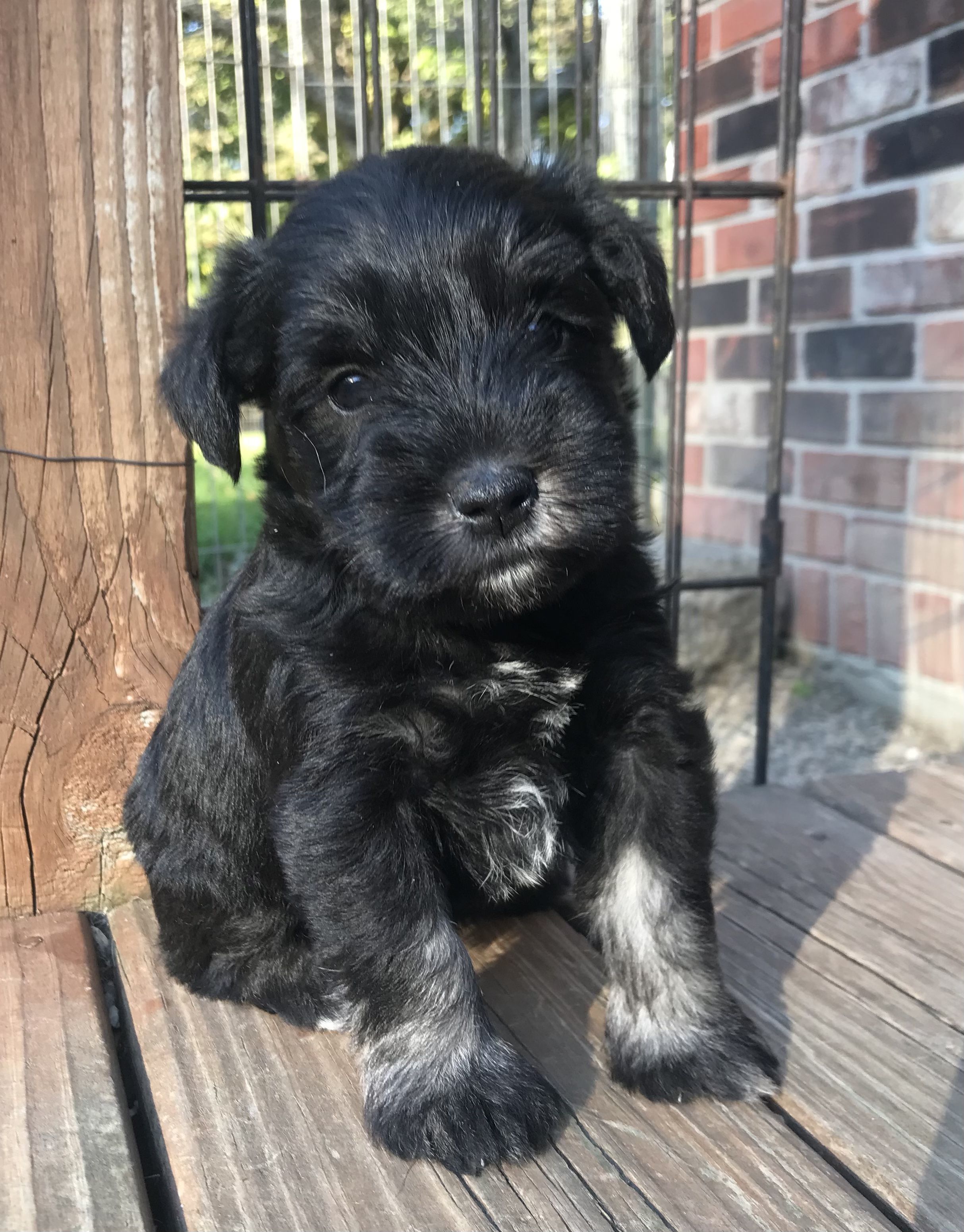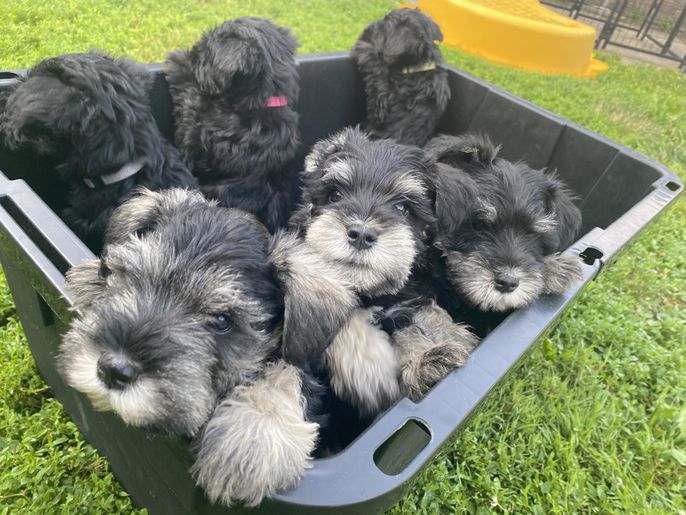 Our puppies include salt and pepper, black and silver, and black. Colors will vary depending on the parent dogs.