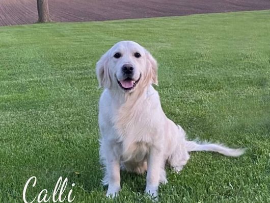 Calli is a female Golden Retriever. Carefully selected as a great representative of her breed, Dindy decided to make her part of their program. Dindy has passed Good Dog’s screening process, which involved a review of their breeding practices, environment, and the mental and physical health of their dogs.