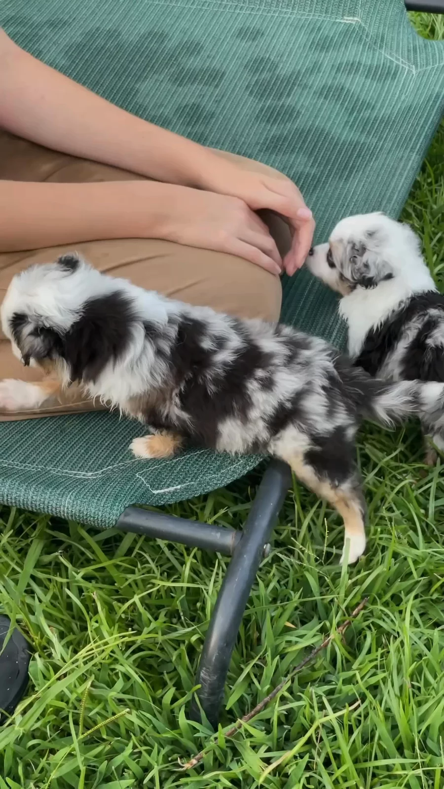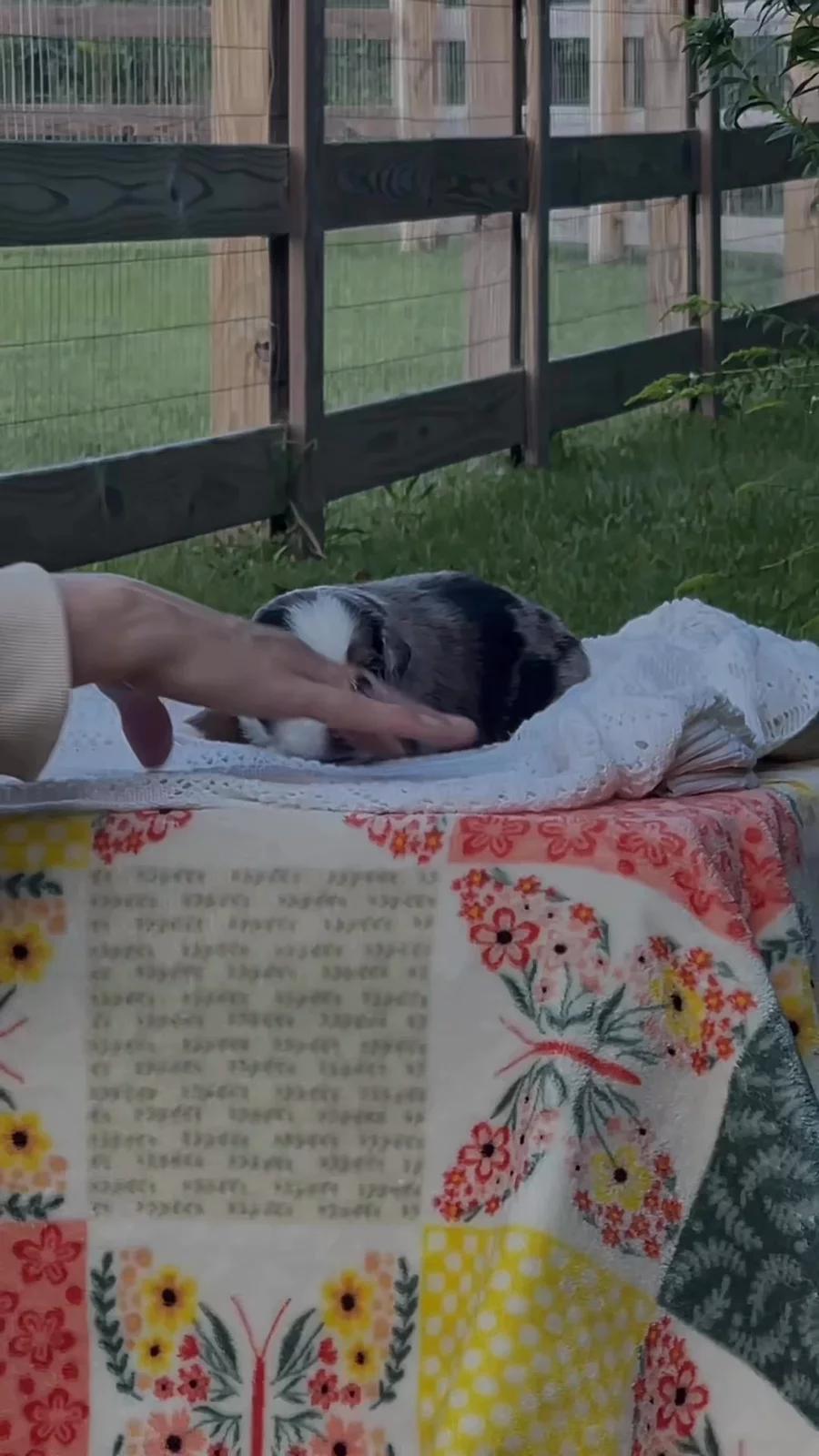 Puppy yard vibes 🐾☀️ Sadly for the puppies not much outdoors time during the day this week 🥵Even in the evening, this heat is still too much for them without being extra careful. So the puppies cooled off in the puppy pool before relaxing with Sarah on the raised bed for a little bit of time outdoors. Wet fur, wagging tails, and all the summer feels 💦💛 “Gravity Falls” litter Finley x Aragorn