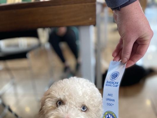 Milo is currently 4x titled. AKC good canine and AKC Urban dog, AKC novice and intermediate trick dog. Working towards AKC advanced trick dog for our 5th title. Extremely smart and so easy and fun to train and work with. He loves going to training and showing off his skills.