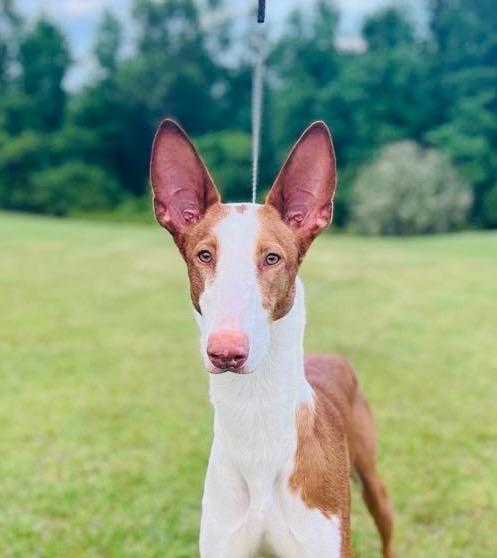 Our Russian Toy puppies are black and tan. Chinese Crested puppies include brown, white and black, pink and slate, and apricot. Ibizan Hound puppies are red and white. Colors will vary depending on the parent dogs.