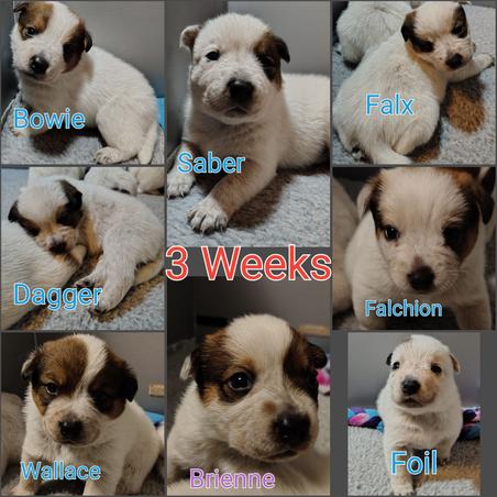 Our puppies include red speckled, blue speckled, and blue. Colors will vary depending on the parent dogs.