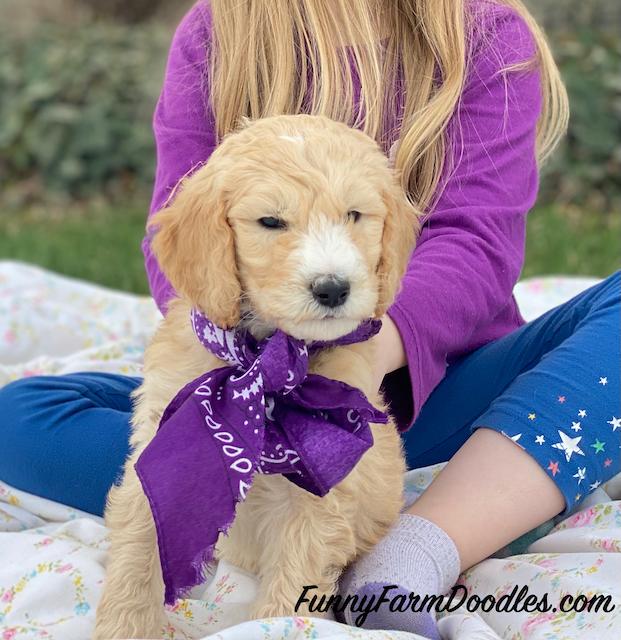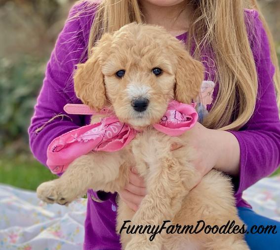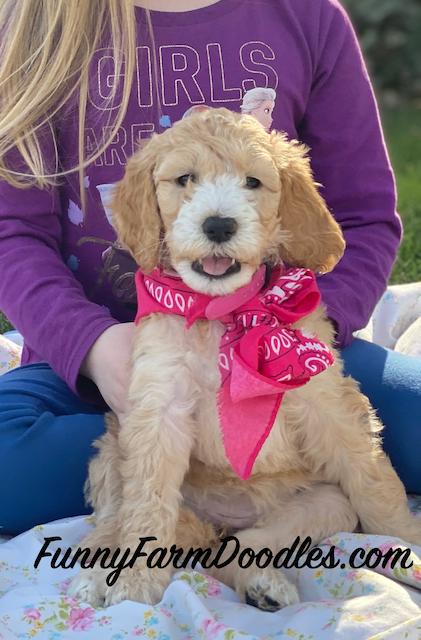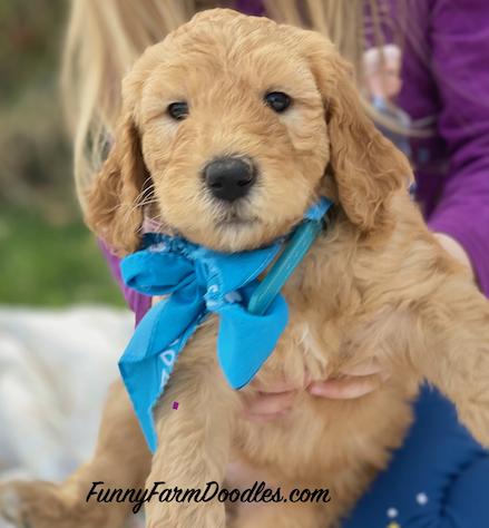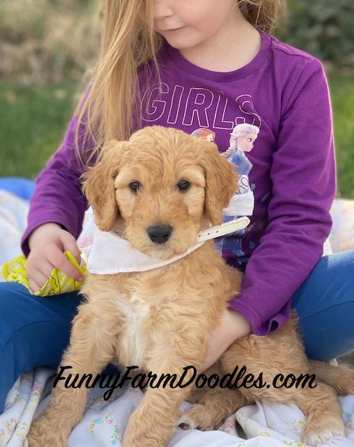 I'm Tanya P., the breeder behind Funny Farm Poodles & Doodles located in Caldwell, ID. We are a small, family operation breeding mostly multigeneration Goldendoodles and occasionally AKC standard poodles. All the animals involved are family pets. We honestly just love raising puppies and placing them in loving homes where others can get the same enjoyment we do from these amazing dogs! We live on a farm so our puppies are exposed to horses, chickens, llama, sheep. We are a family of 5 with 3 teens and we all help with the puppy raising process!