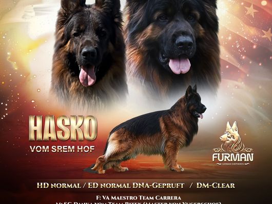 HASKO, is a a unremarkable black and red, solid black mask with deep rich stunning pigmentation. He possesses a long thick coat with vibrant deep red tones and massive big bone structure, he weighs around 100 lb. Hasko is a large framed West German shoal line that carries himself with confidence and pride. He is very outgoing, confident and loves to meet new people, does excellent around other dogs, making Him a joy to be around. His temper is balanced and reliable. He has a mild drive but a great on and off switch. Hasko is a big love bug! Automatically correct with excellent structure.