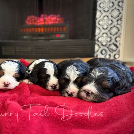 Five adorable mini F1 Bernedoodle puppies snuggled together on a bright red blanket in front of a cozy fireplace. Each puppy features unique tri-colored markings, including black, white, and tan, with soft, wavy coats and sweet, sleepy expressions. Perfect for showcasing the charm and warmth of these family-raised Bernedoodles.