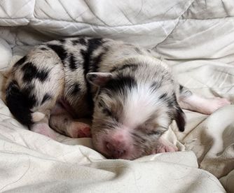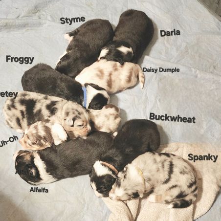 Our puppies include tri-color, black and white, blue merle, red merle, and white and red. Colors will vary depending on the parent dogs.