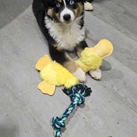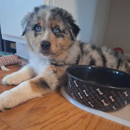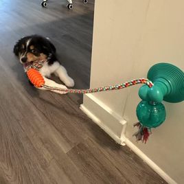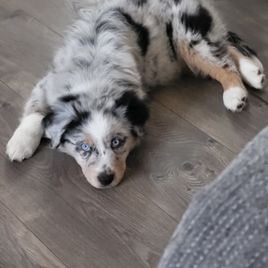 He has been a typical active Aussie pup. At times pure delight and others pure terror. He earned the affectionate nickname of little monster. If you have not discovered cows hooves as a chew toy, do yourself a favor. He loves them as his favorite chew item. Saves a lot of little chewing accidents.