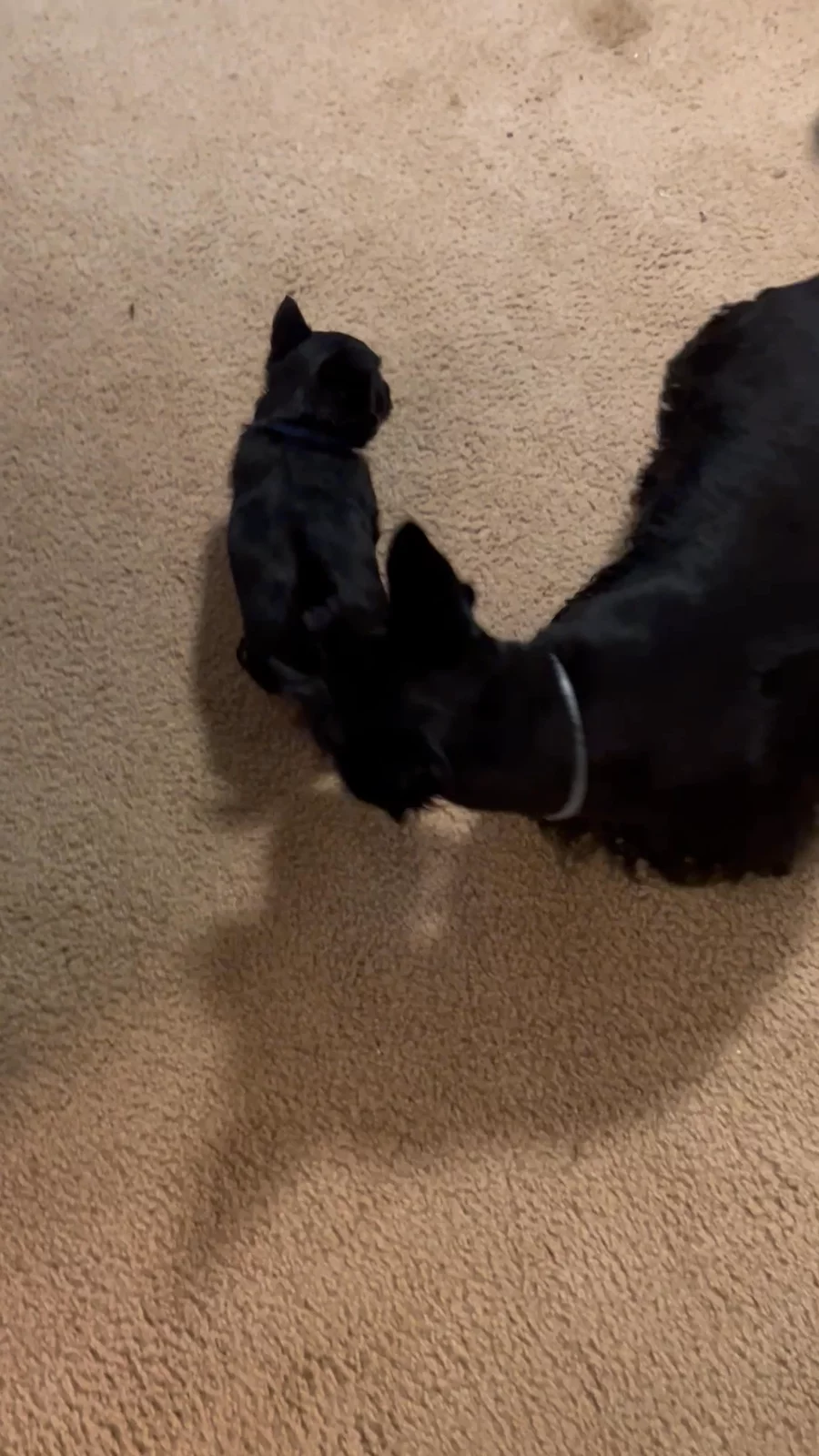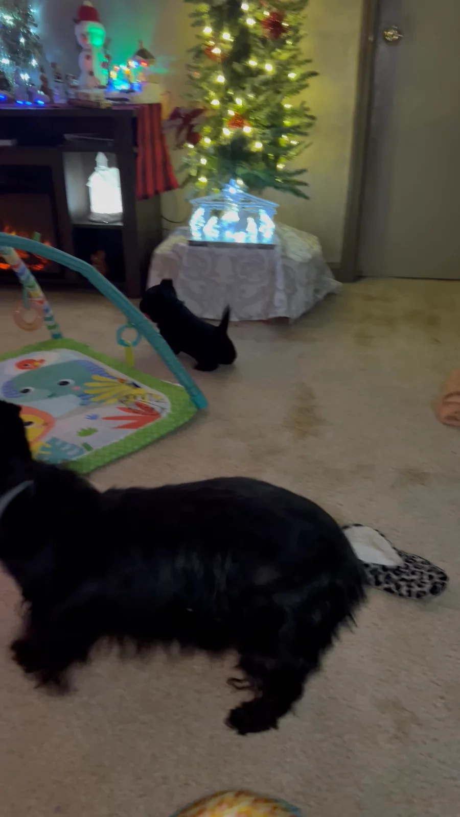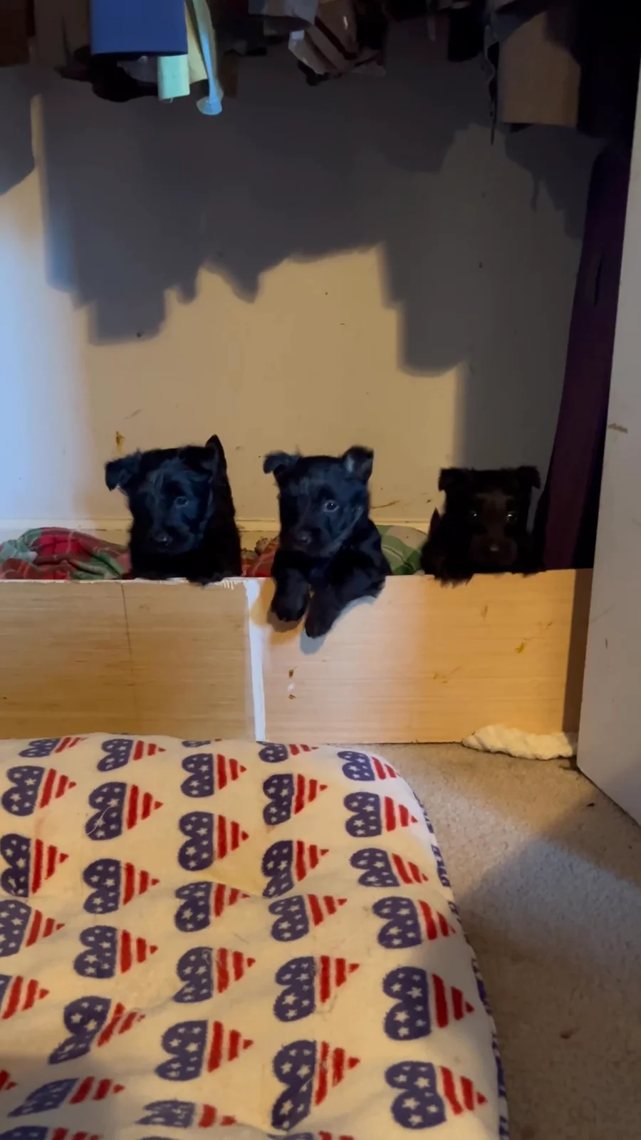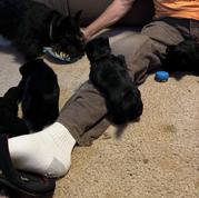 The puppies are progressing nicely. They are very clumsy, but learning how to walk/run and starting to play with toys. I have five adult Scottie’s showing them the ropes.