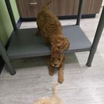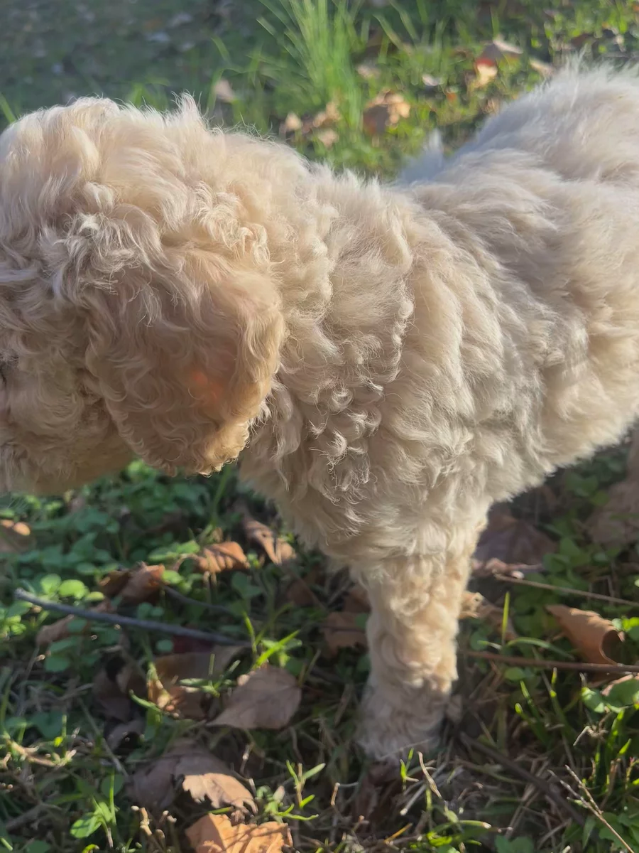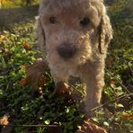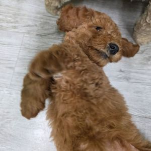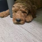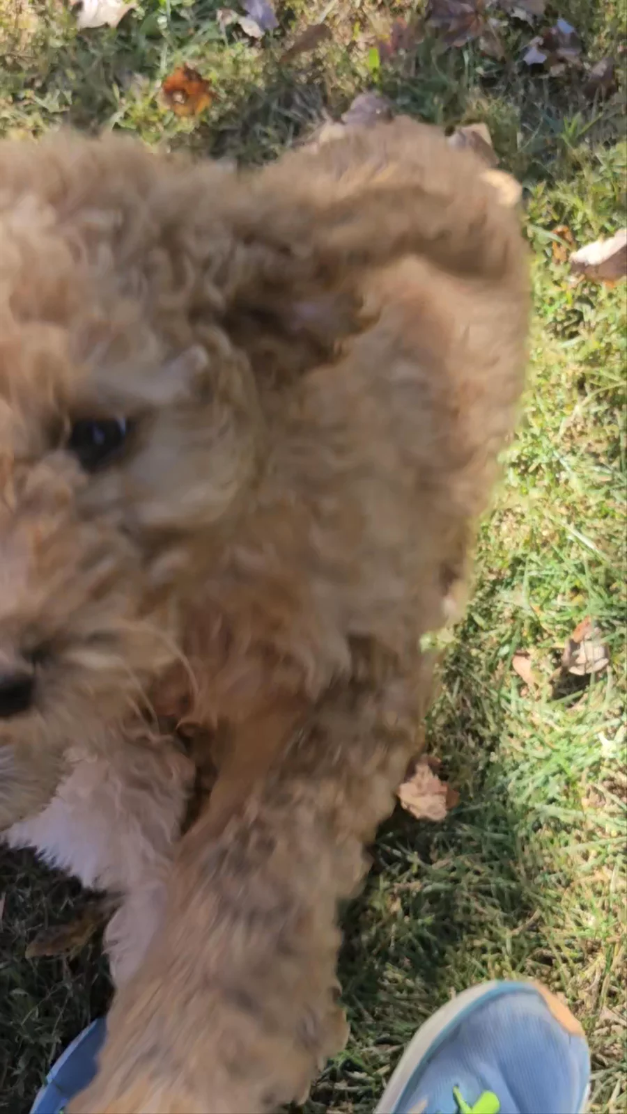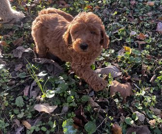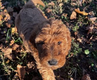 Apricot red f1bb goldendoodle, hazel eyes and liver nose, very curly hair 45 lb, very very smart, learns tricks and follows commands, obedient.