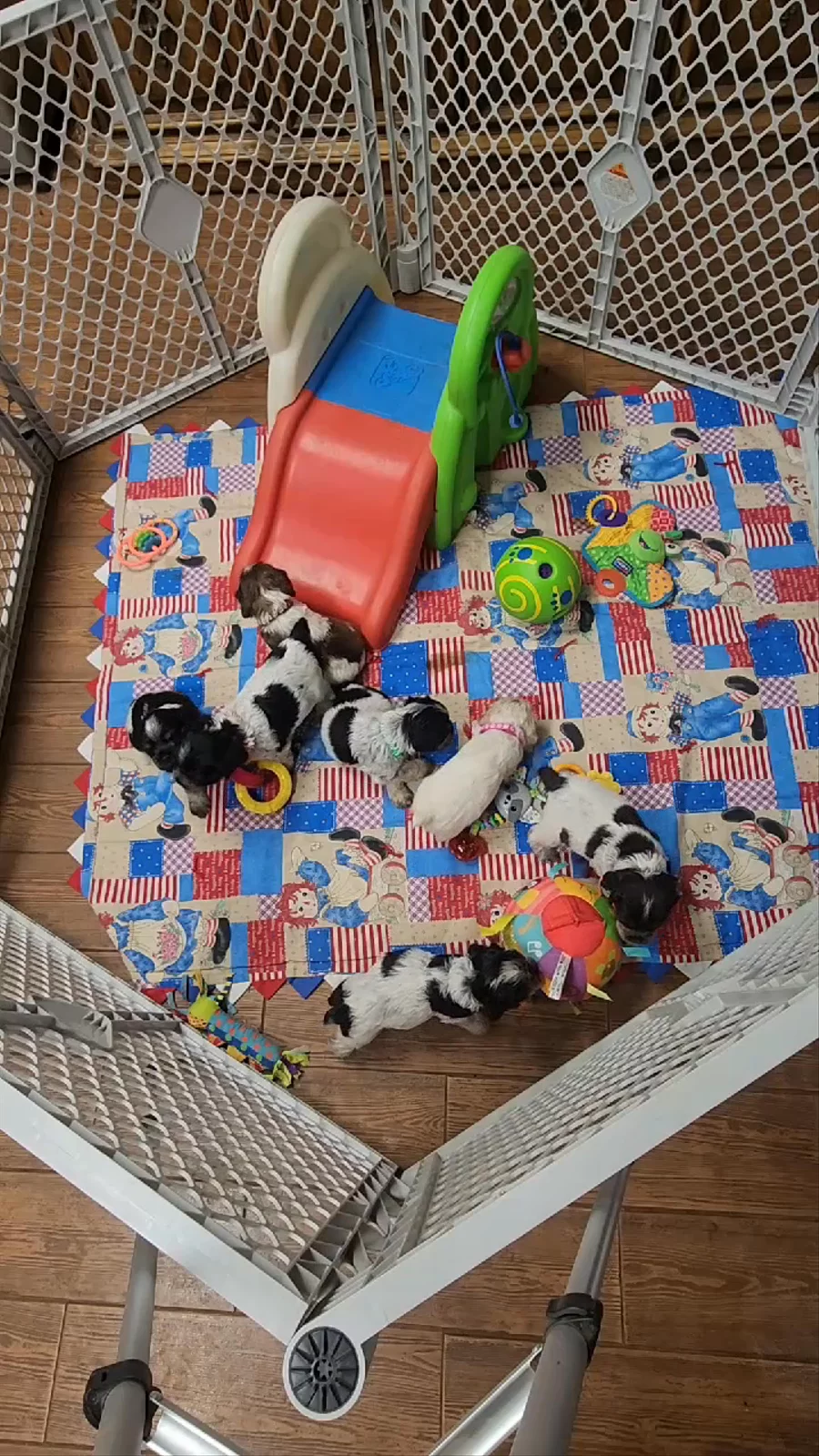 The puppies are on the move, waddling around and playing with toys. They like to explore the room. They are eating well and getting big!