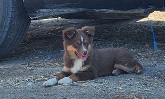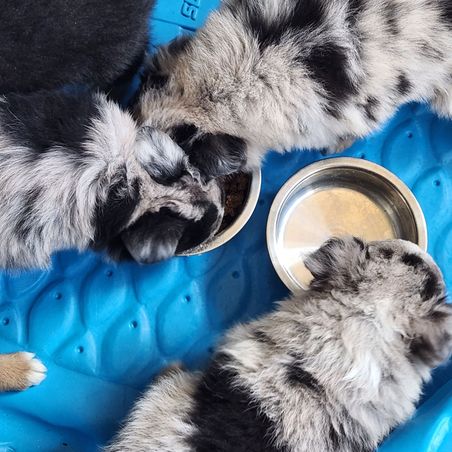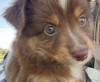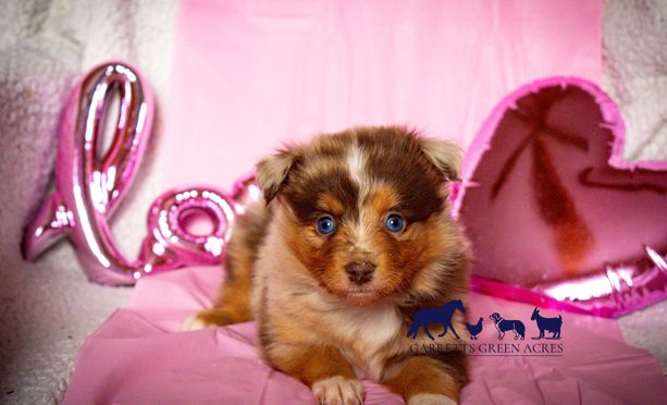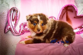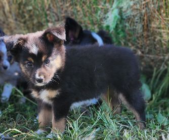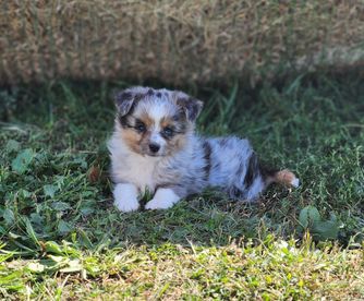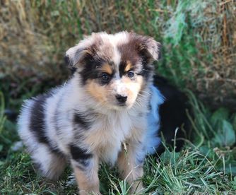 Our Miniature Australian Shepherd puppies include blue merle, black tri, red tri, and red merle. Toy Australian Shepherd puppies include black tri and red tri. Colors will vary depending on the parent dogs.