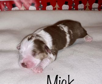 Minimal White Red Merle Male with two blue eyes. Between 13-14” and weighs about 14 pounds. Levi has a thick coat and a nice build. BET lines