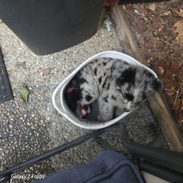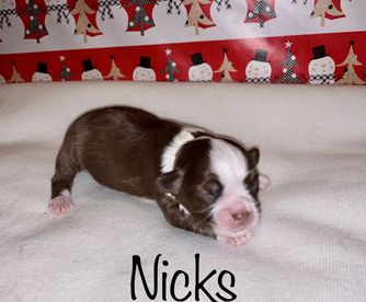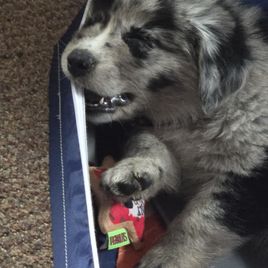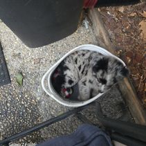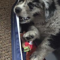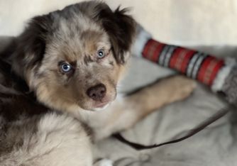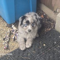 Kiddy Cat is a 15” red merle male with toy size in his background. He is AKC Registered Australian Shepherd. He is still filling out, but has a wonderful personality & build.