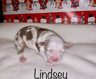 Dizzy is 14.5-15” very light red merle female. She is beautifully built and has the sweetest disposition.