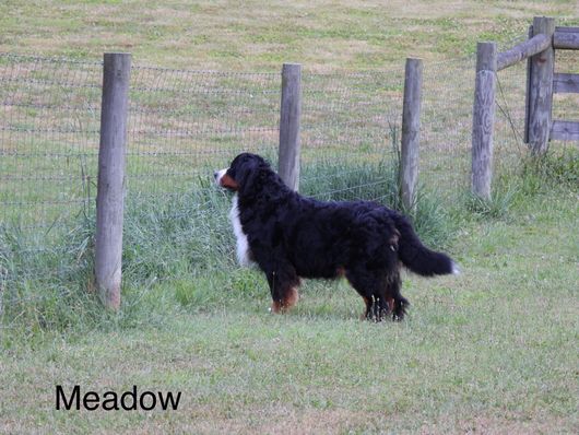 Meadow knows no strangers she is ready to sit in your lap as soon as you sit down. She is a great mother to her puppies.