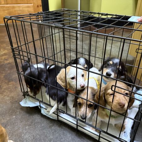 Our Bernedoodle puppies include black and white, tri-color, and merle. Dachshund puppies include piebald, red, brindle, chocolate and tan, black and tan, and dapple. Colors will vary depending on the parent dogs.