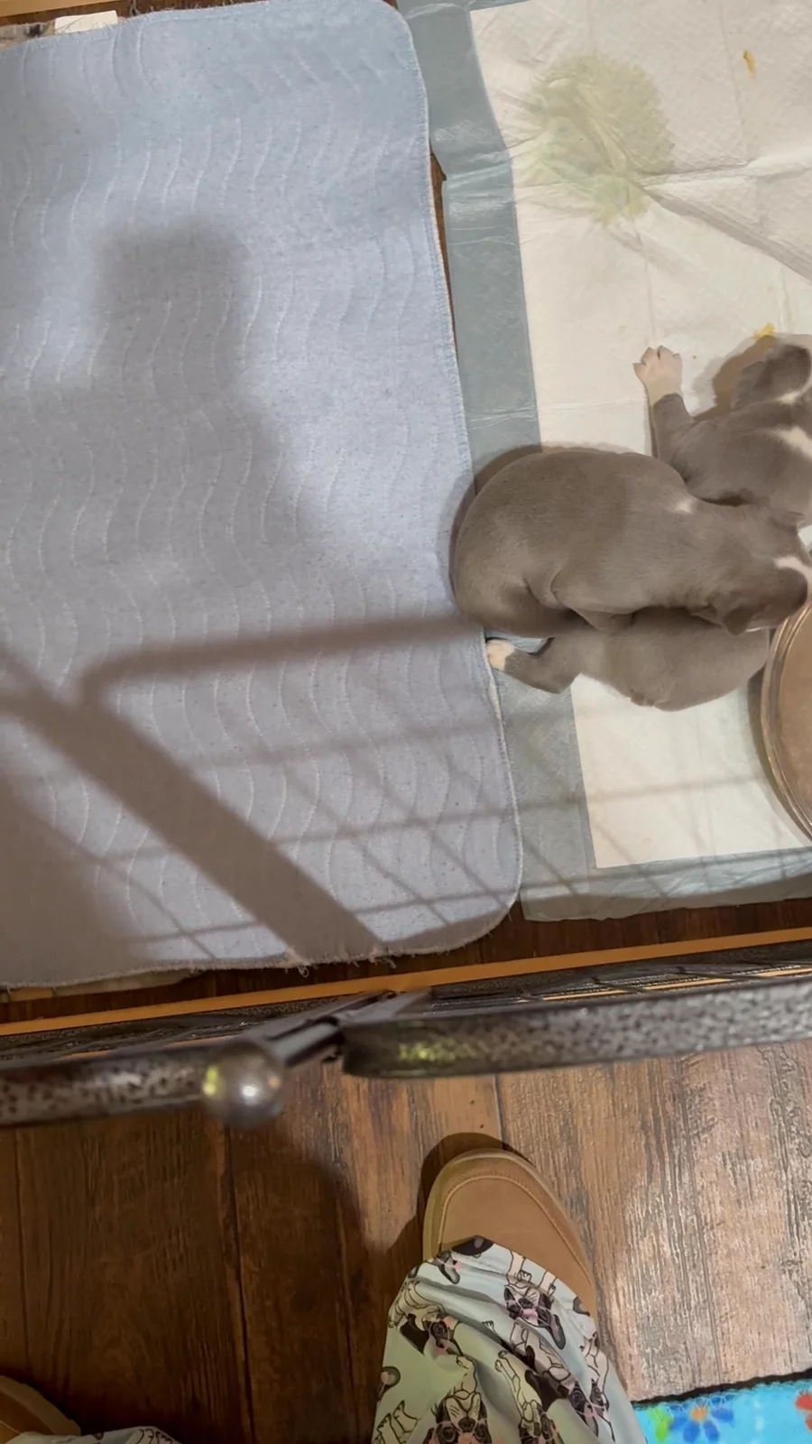 The puppies are waddling around now! Miss Jasmine was the first one on her feet and is running circles around the other ones, but Cinderella is catching up to her quickly.