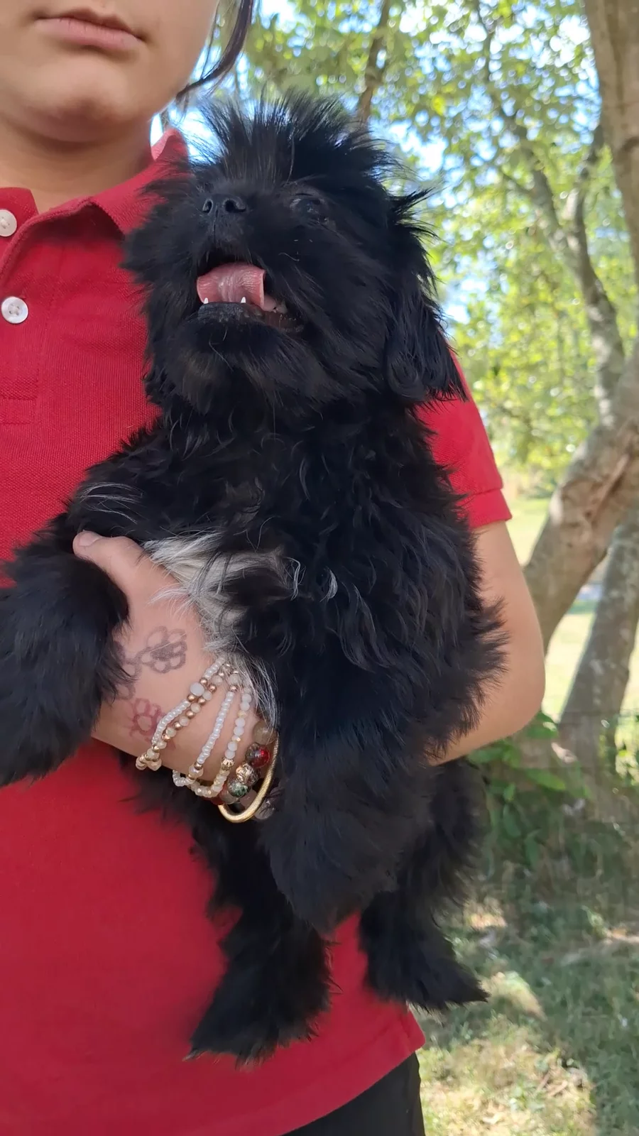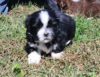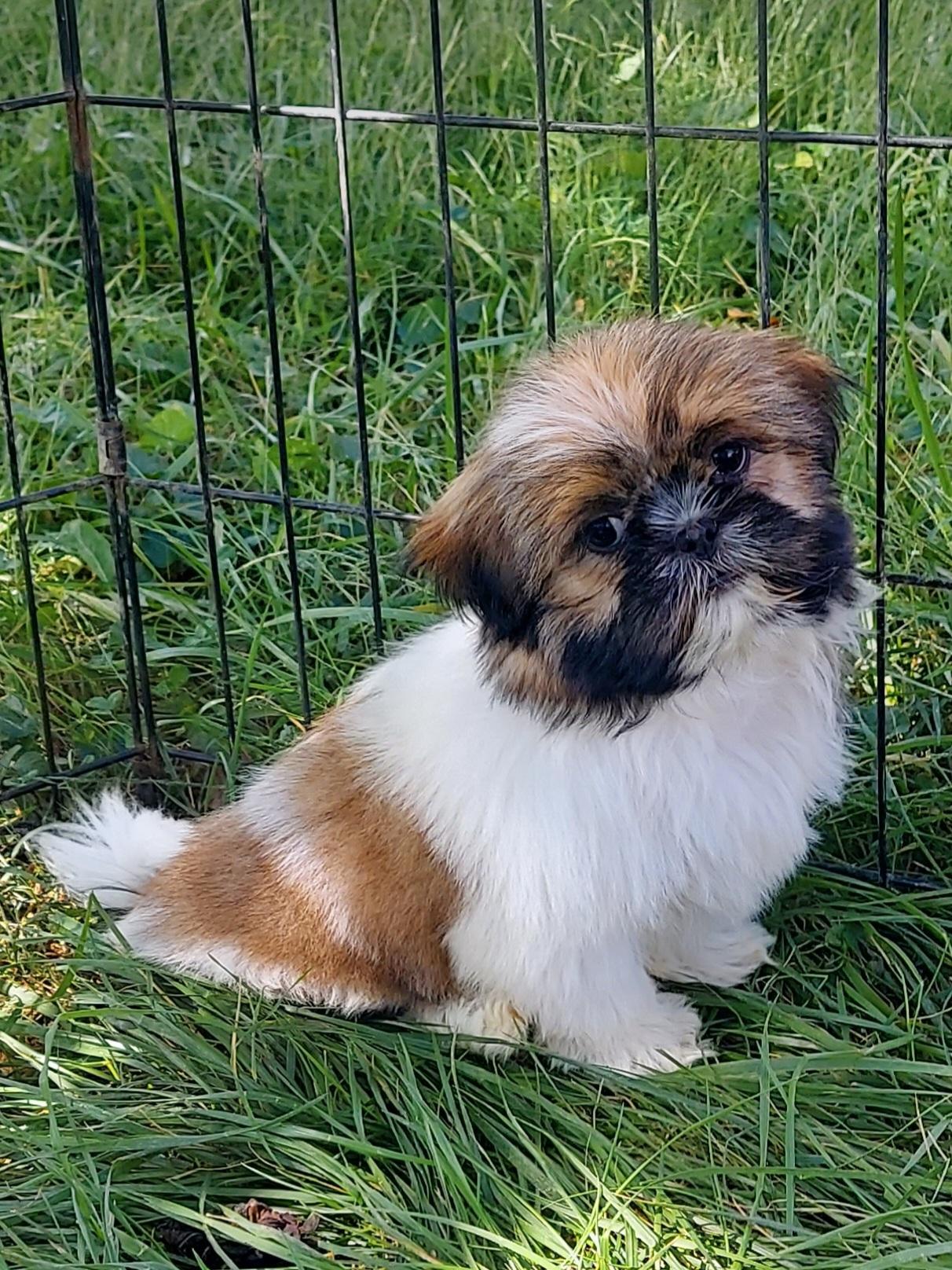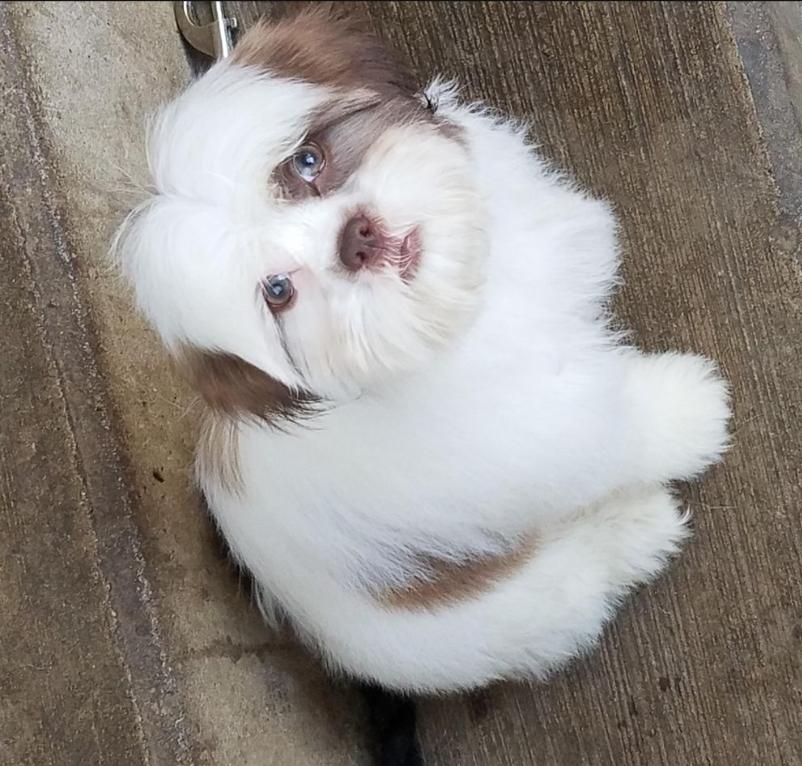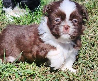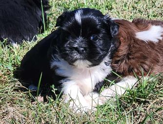 Our Shih Tzu puppies include black, liver, blue, liver and white, blue and white, black and white, and brindle. Colors will vary depending on the parent dogs.