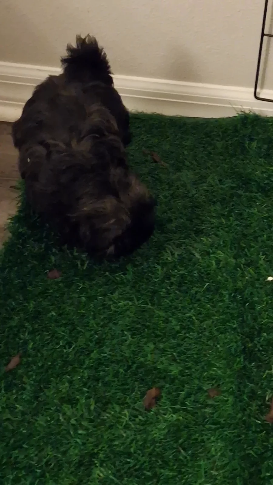 The Wookie babies are officially six weeks old, and potty training has been a complete success! These pups are my smartest bunch yet. All have undergone scent training and can successfully use pee-pads and faux grass trays. Here is one of the pups in action. The final stage has recently begun with outdoor training accompanied by parent dogs. By the time they go to their forever homes, their core training should kick in. Its amazing how fast they pick up with a little patience and guidance.