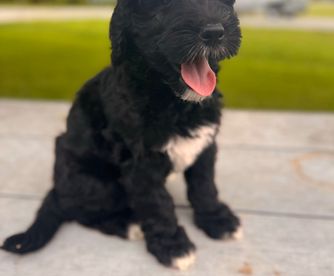 Our Bernedoodle puppies include chocolate merle, brown and white, black, black and white, and merle. Colors will vary depending on the parent dogs.