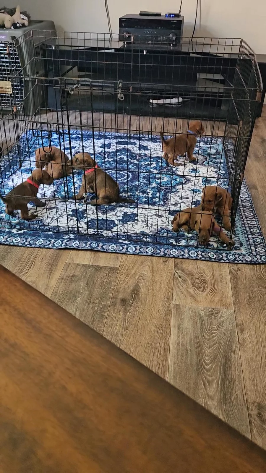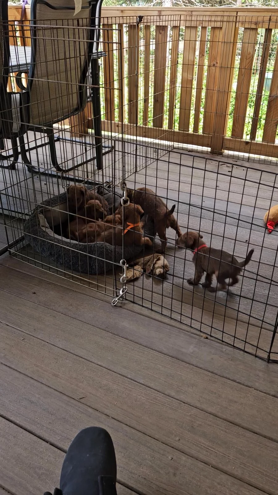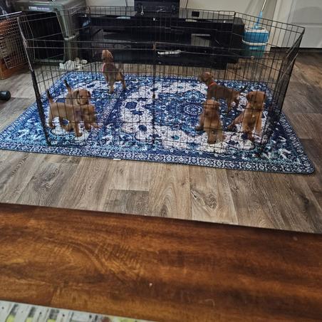 Out of the welping box and into the living room for some fun in the warmth of the day,