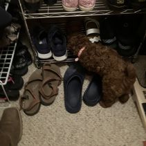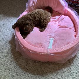 zooming and chewing her toys to sleeping for a while. Lucy is very loving and is learning to go to the door to oops inside. She’s also learning to sit on command. We are very bonded and love her very much❣️