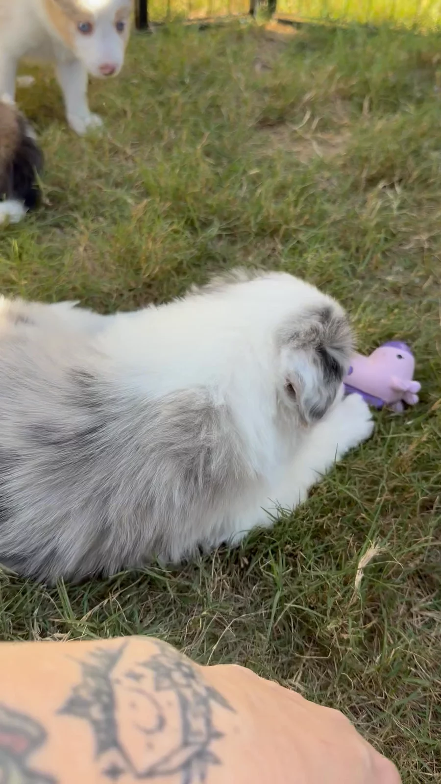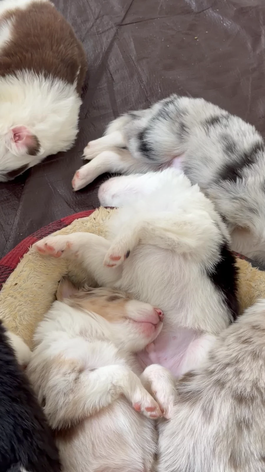 Our puppies include black and white, red merle, red, sable, sable merle, and white and red merle. Colors will vary depending on the parent dogs.