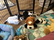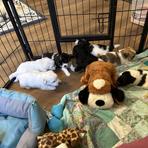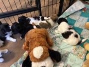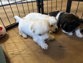 We put puppies from both litters together today in playpen in living room. (Hallmark movie is background noise!) Initially the puppies seemed a bit anxious.. new territory and moms not around! But gradually began to play and interact with each other. Seems that scooting backwards is a tad easier for some!! 🥰