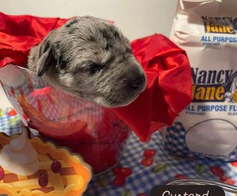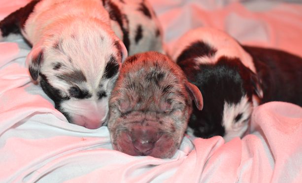 Our puppies include blue and white and mantle. Colors will vary depending on the parent dogs.
