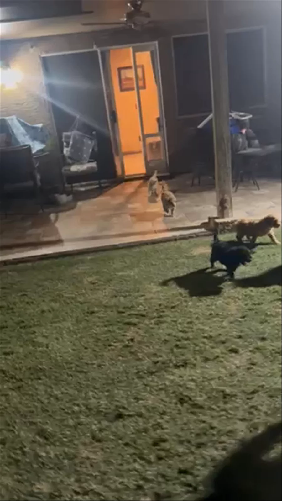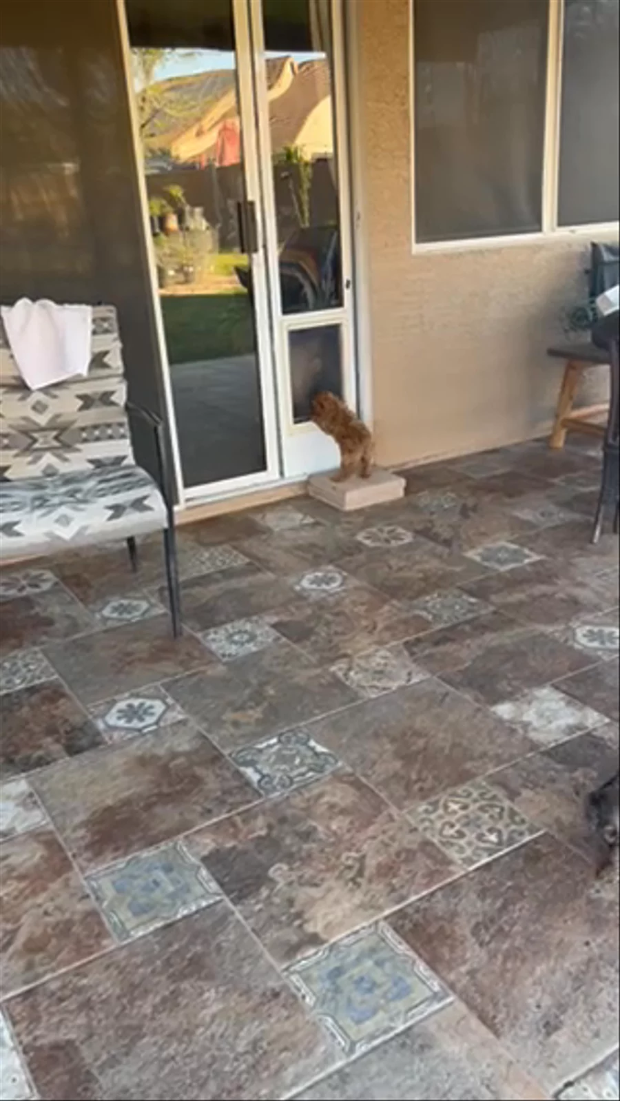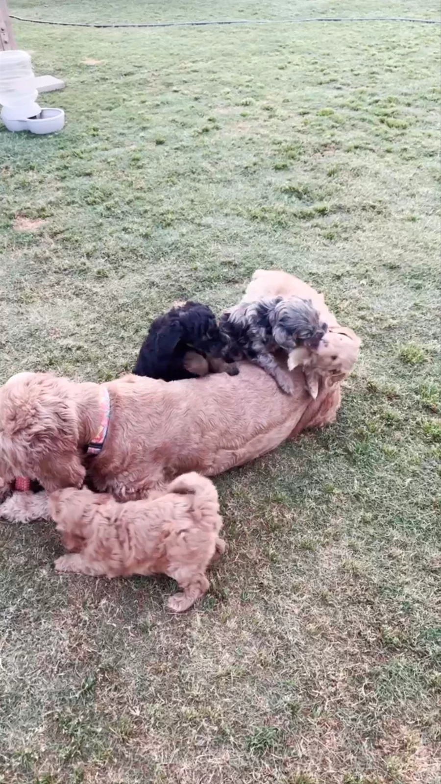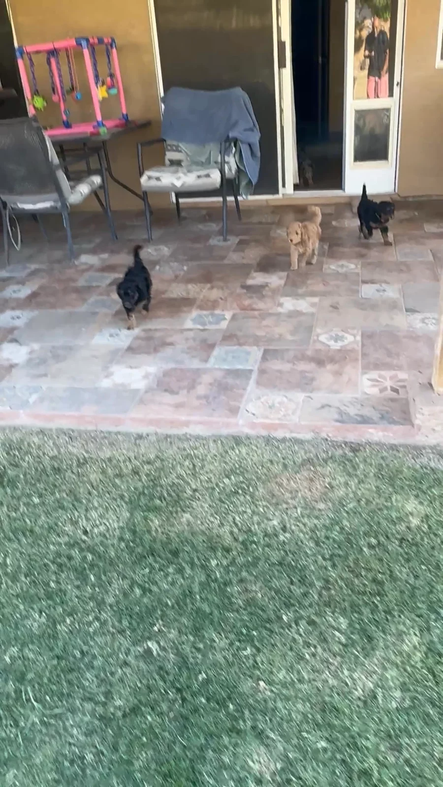 The last puppy to learn the doggy door system (Ariel) and Attina playing with her brothers Scuttle and Simon- lazily playing it’s getting warm out here in the afternoon 🥵
