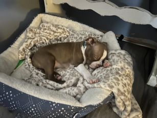 Loves to snuggle and give kisses. Loves kids and is APRI registered. When she was a Puppy her coloring was registered as Lilac Brindle and white. As she gets older, her Lilac has more of a tan coloring.