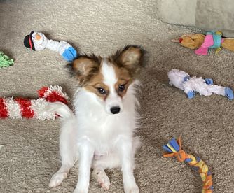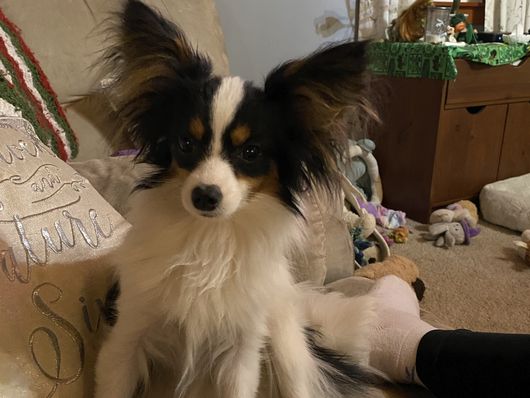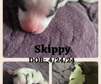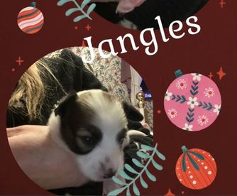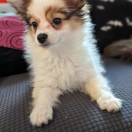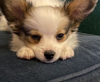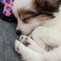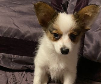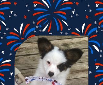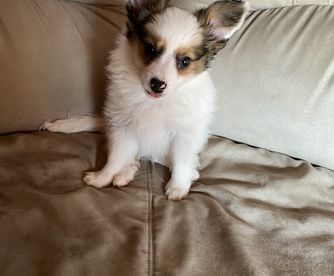 Our Collie puppies are blue merle. Papillon puppies include white and sable, brown and white, and black brown and white. Colors will vary depending on the parent dogs.