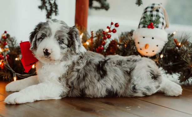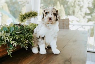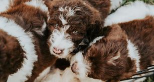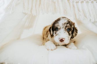 Our Aussiedoodle puppies include brown and white, blue merle, red merle, and black and white. Colors will vary depending on the parent dogs.