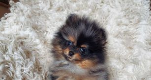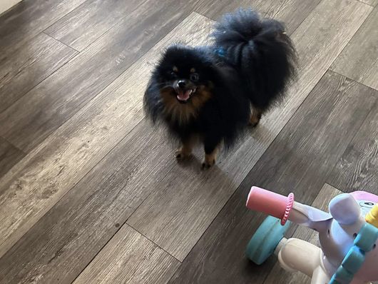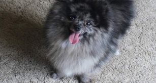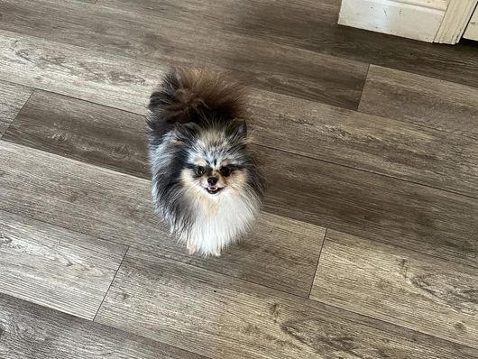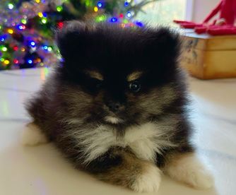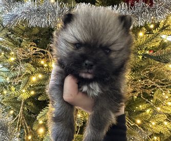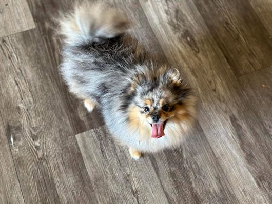 Foxy is the daughter to our favorite Pom Fiona! Fiona is the sweetest and comment Pom so we kept a daughter back from her and foxy is just like Fiona she is very sweet, she loves kids and people! Foxy is 4 1/2 pounds, she is a blue Merle and tan and has a tiny teddy bear face!