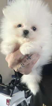 Rocco is a 5lbs all white Pomeranian, he is such a sweet boy. He loves to cuddle and he loves playing with his toys and children along with other dogs. Rocco has such a beautiful coat and tiny little teddy bear face.