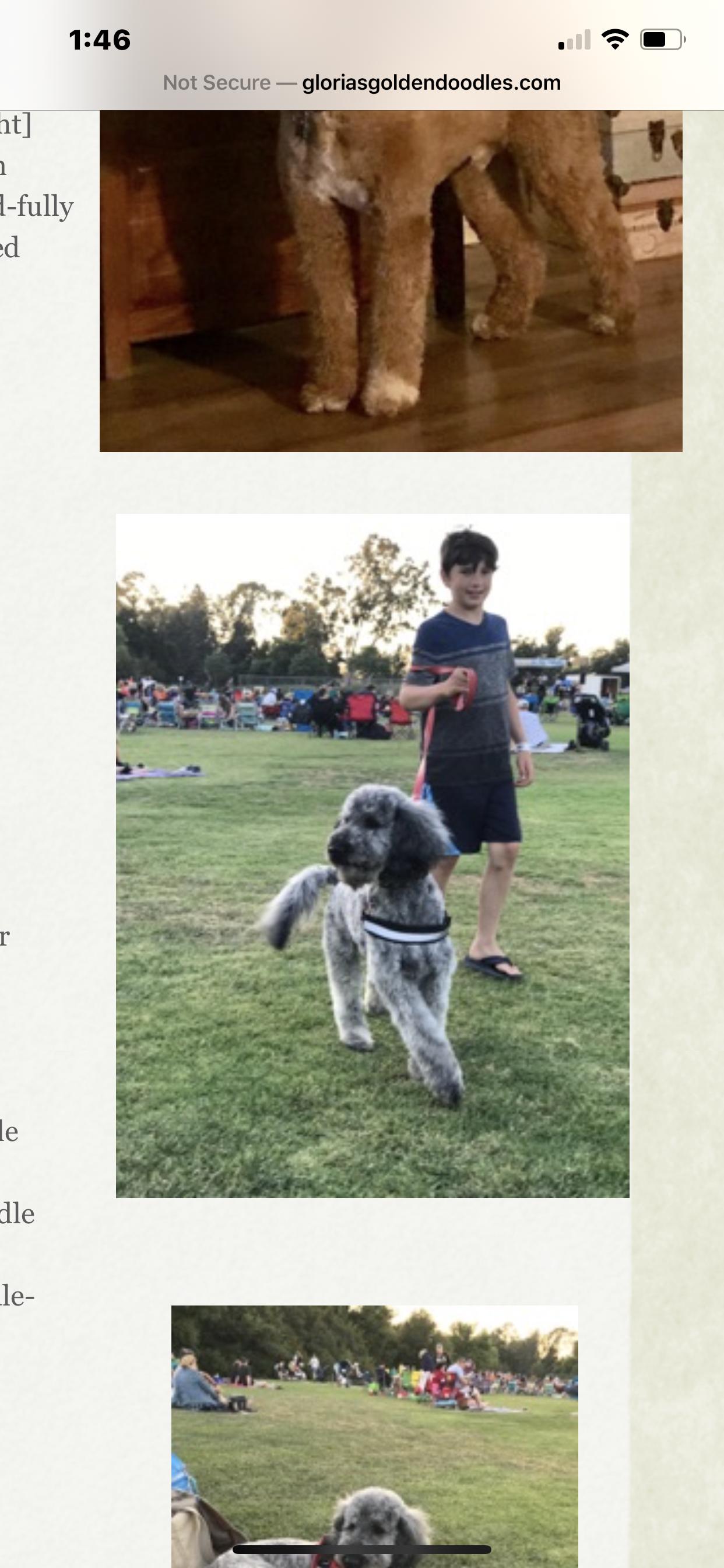 I'm Gloria S., the breeder behind Gloria's Goldendoodles located in Murrieta Ca, CA. Our Dogs are bred for health and disposition. We complete DNA testing for inheritable diseases and also include OFA for hips, elbows and eye certification. We also socialize our puppies and introduce new experiences and age appropriate challenges as puppies mature . We have several our our Poodles and Doodles that have become Therapy and Service dogs .
