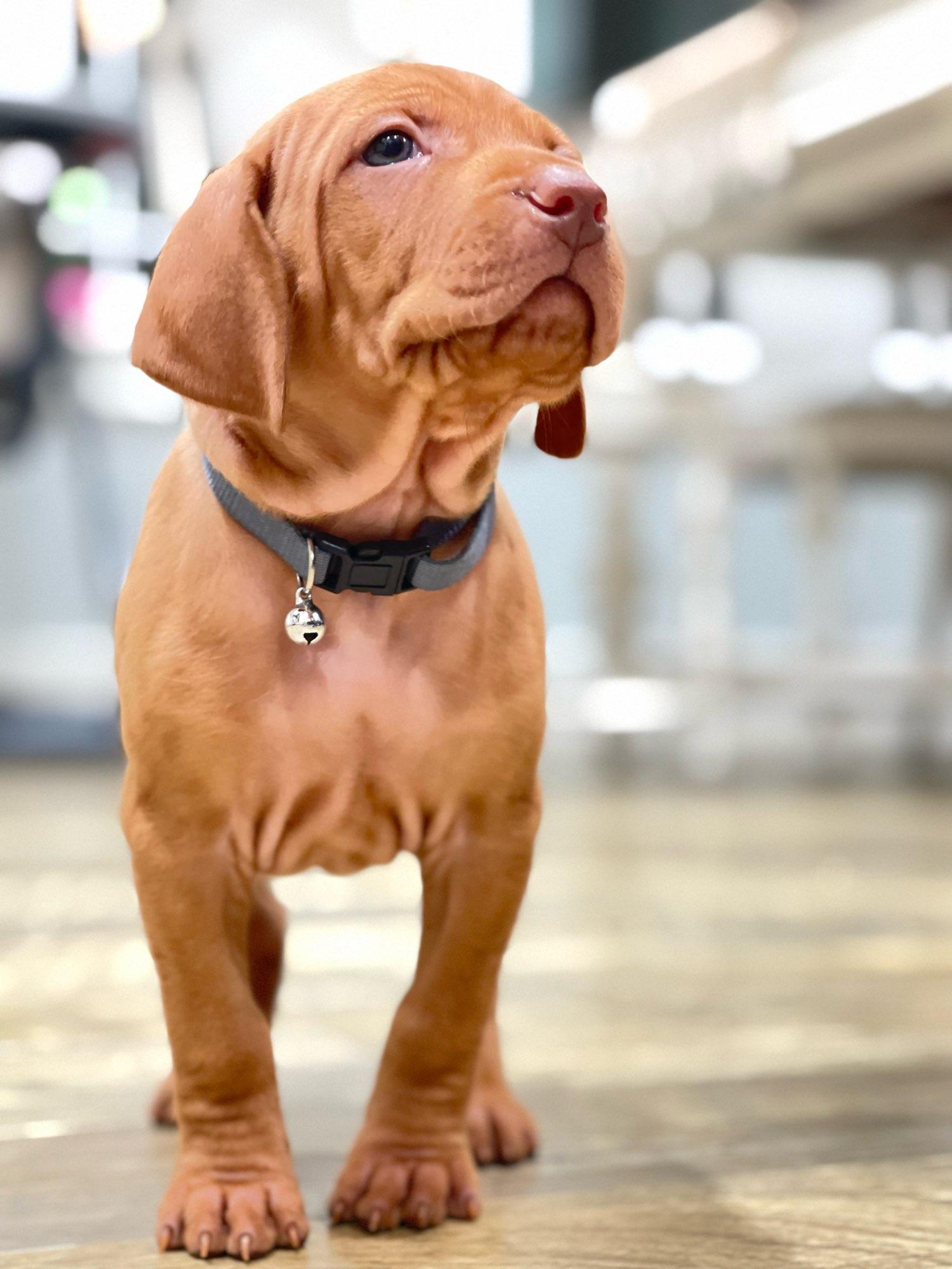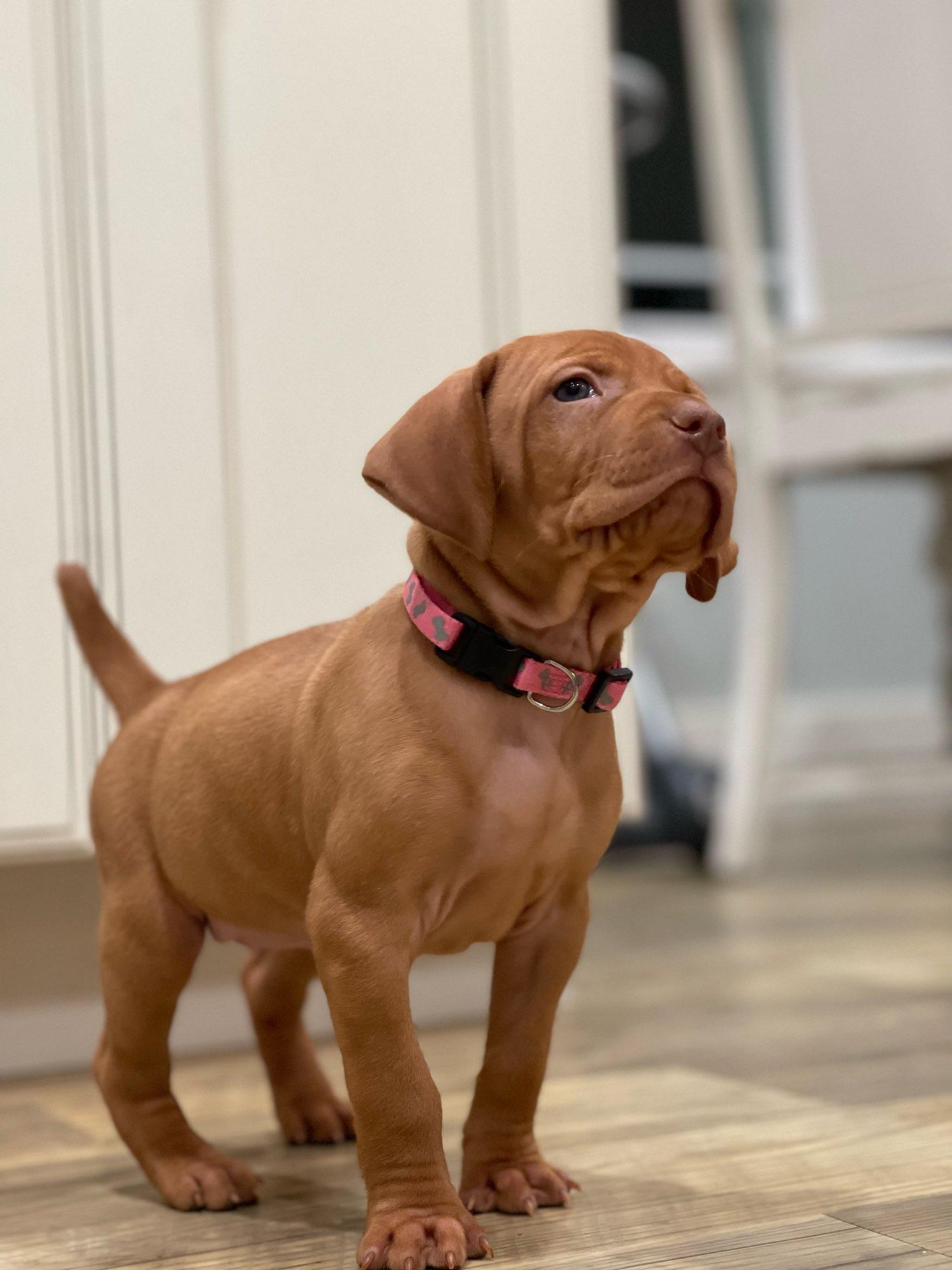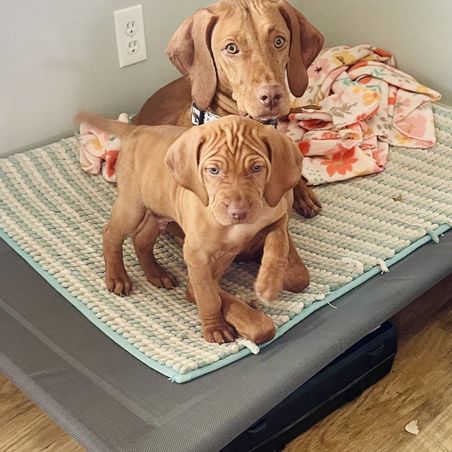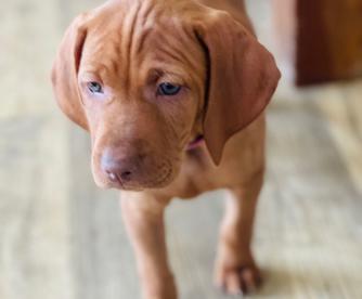 Banks is a medium-large sized Vizsla. She is a very smart dog and comes from a long line of field trail champions. She lives in our home with us and gets a long great with the kids, people, and other animals.